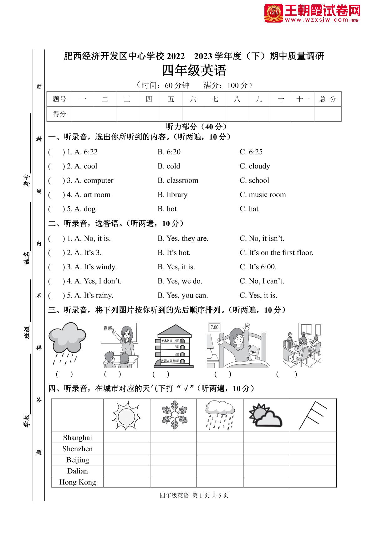 安徽省合肥市肥西县经济开发区中心学校2022-2023学年度下学期期中质量调研四年级英语(PEP版)【无听力音频】