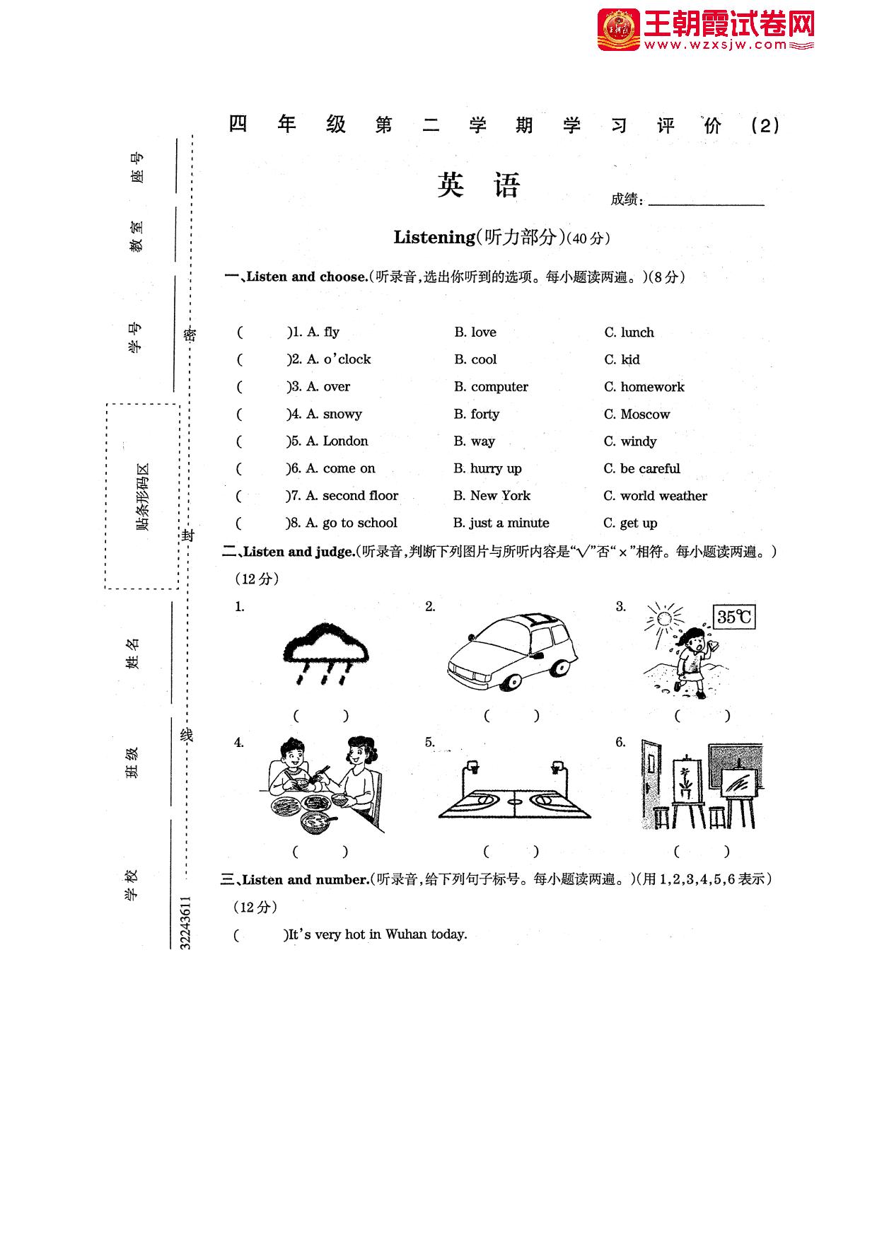 四年级英语人教PEP版(三起始)下册期中卷