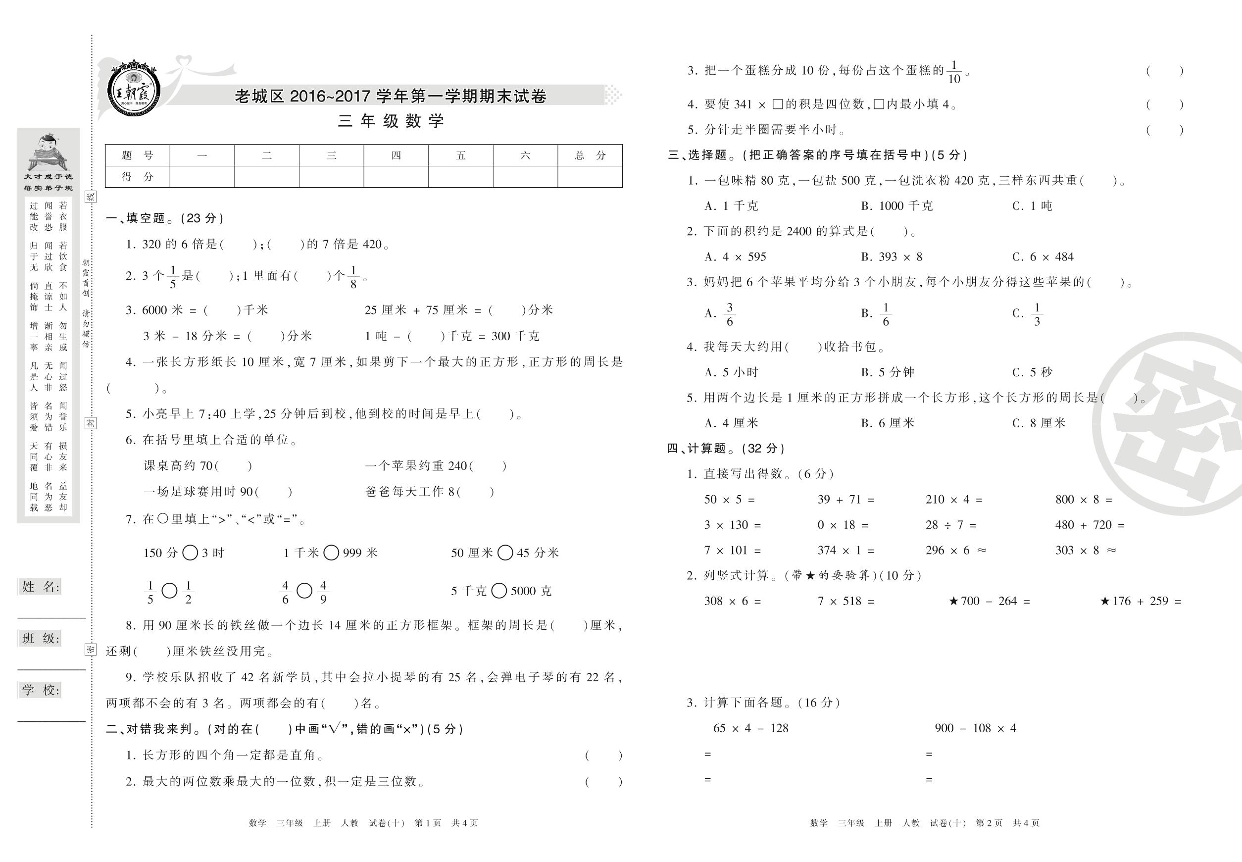 2016-2017学年第一学期洛阳市老城区三年级数学试卷(人教版)【10】