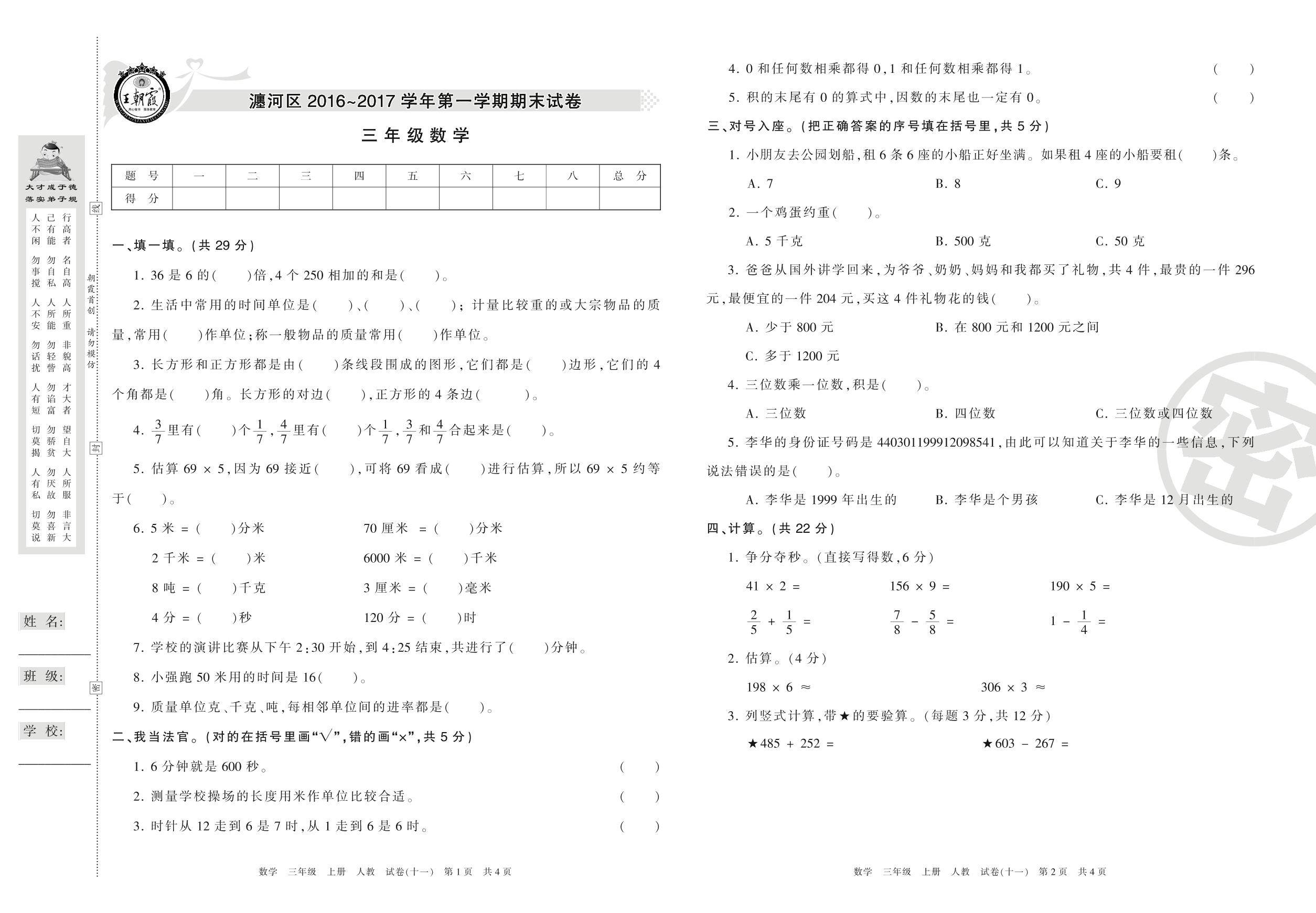 2016-2017学年第一学期洛阳市瀍河区三年级数学试卷(人教版)【11】
