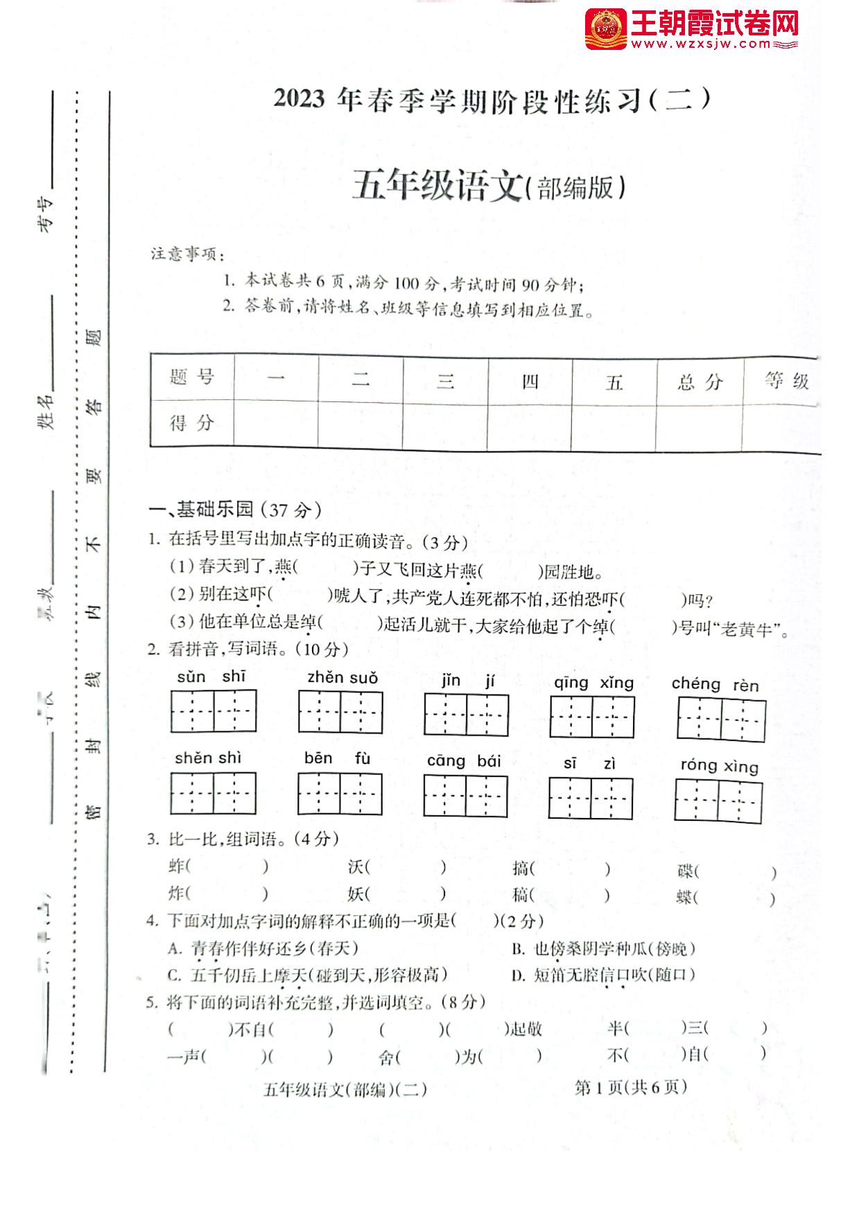 五年级语文人教版下册期中卷