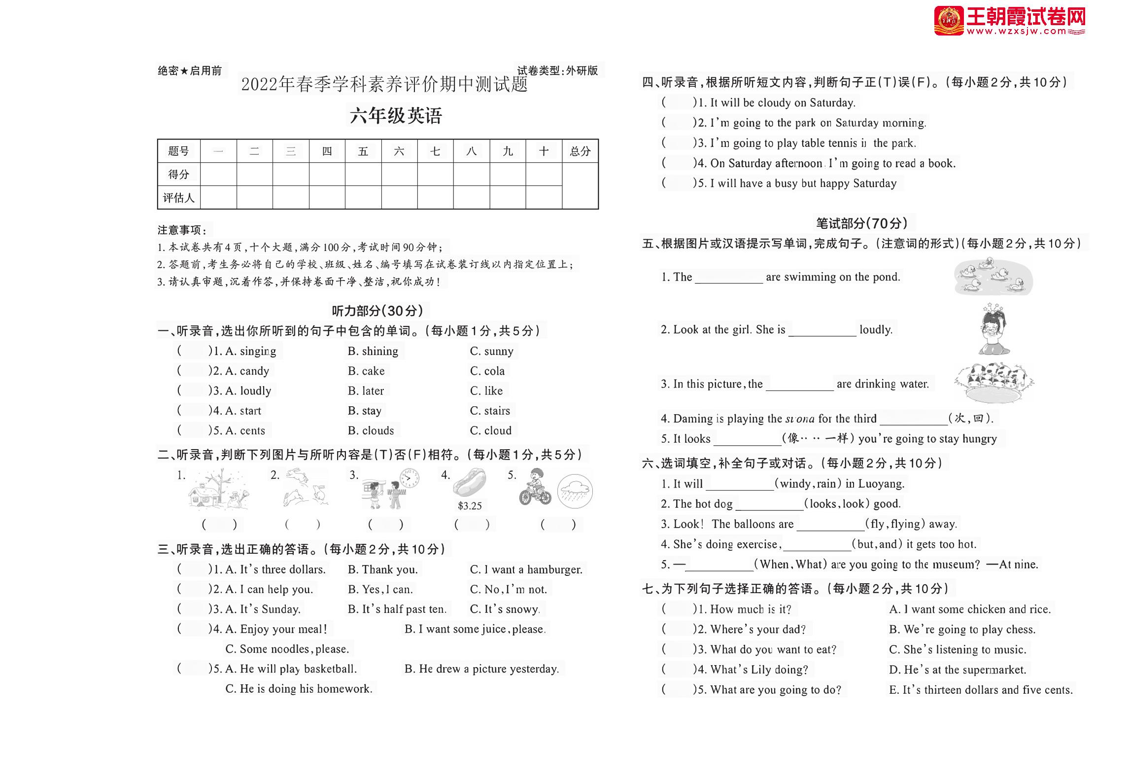 河南省洛阳市栾川县2022年春季学科素养评价期中测试题六年级英语(外研版)