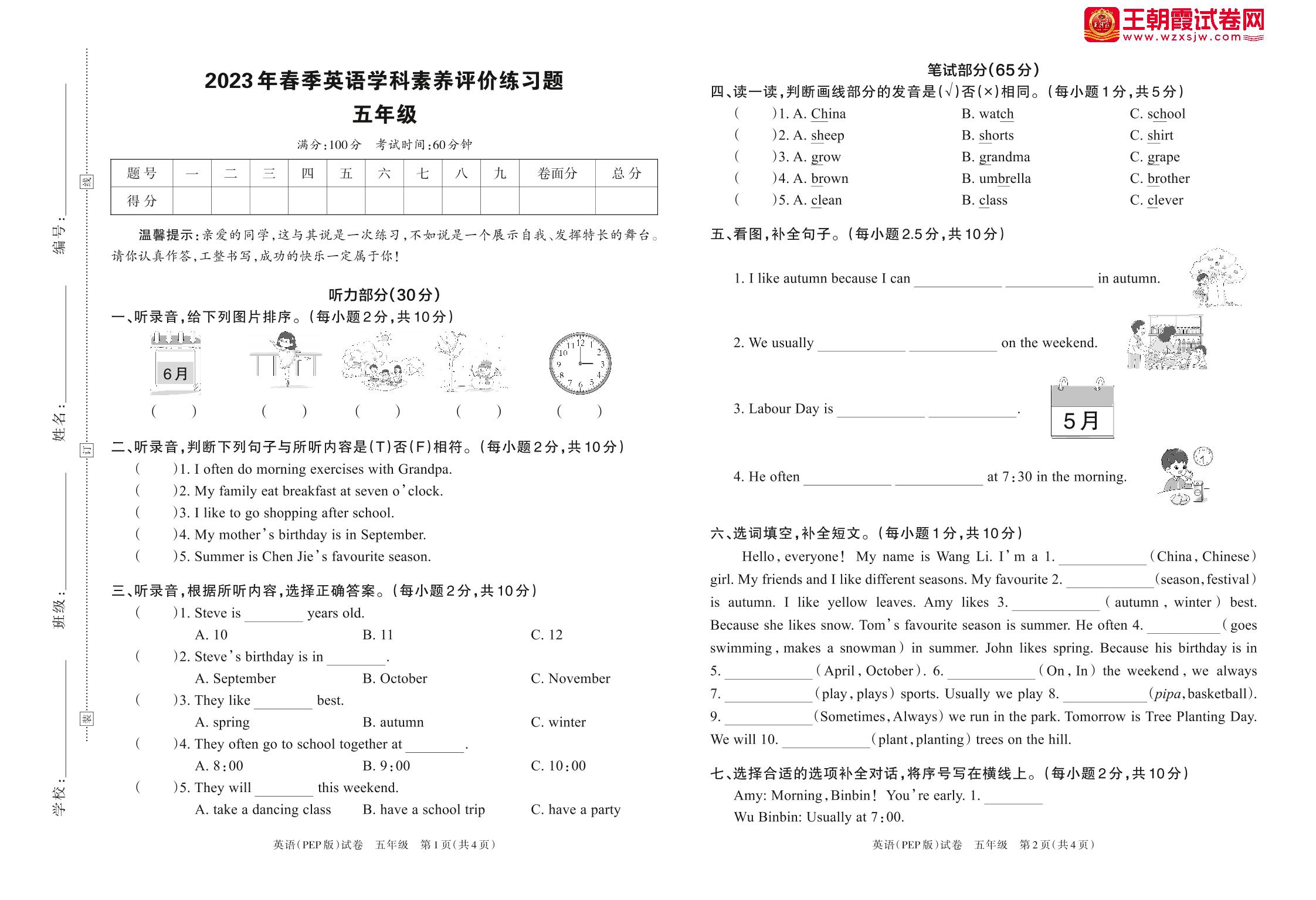 河南省新乡市获嘉县2022—2023学年下学期期中学科素养评价练习题五年级英语(人教PEP版)