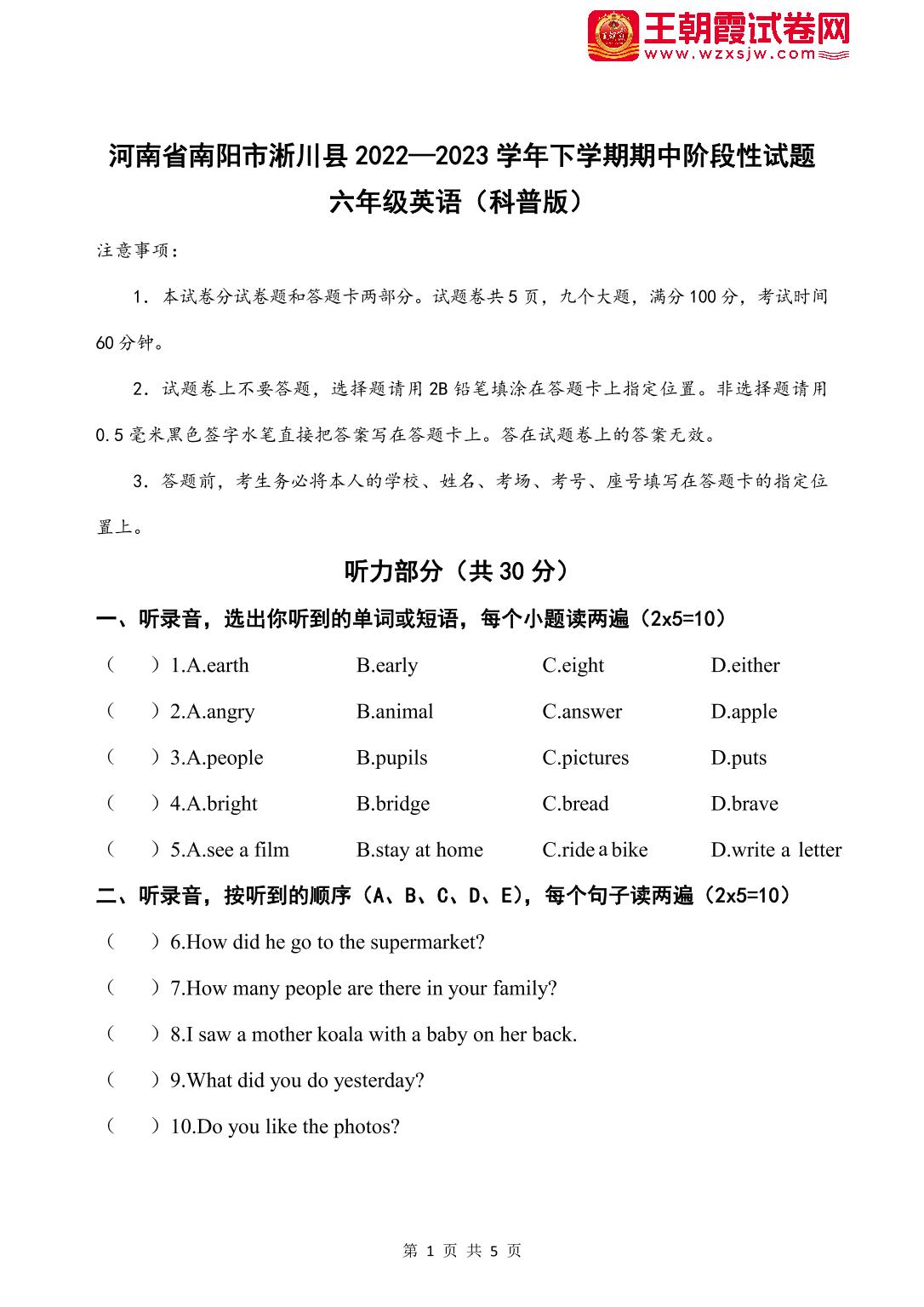河南省南阳市淅川县2022—2023学年下学期期中阶段性试题六年级英语(科普版)【无听力音频】