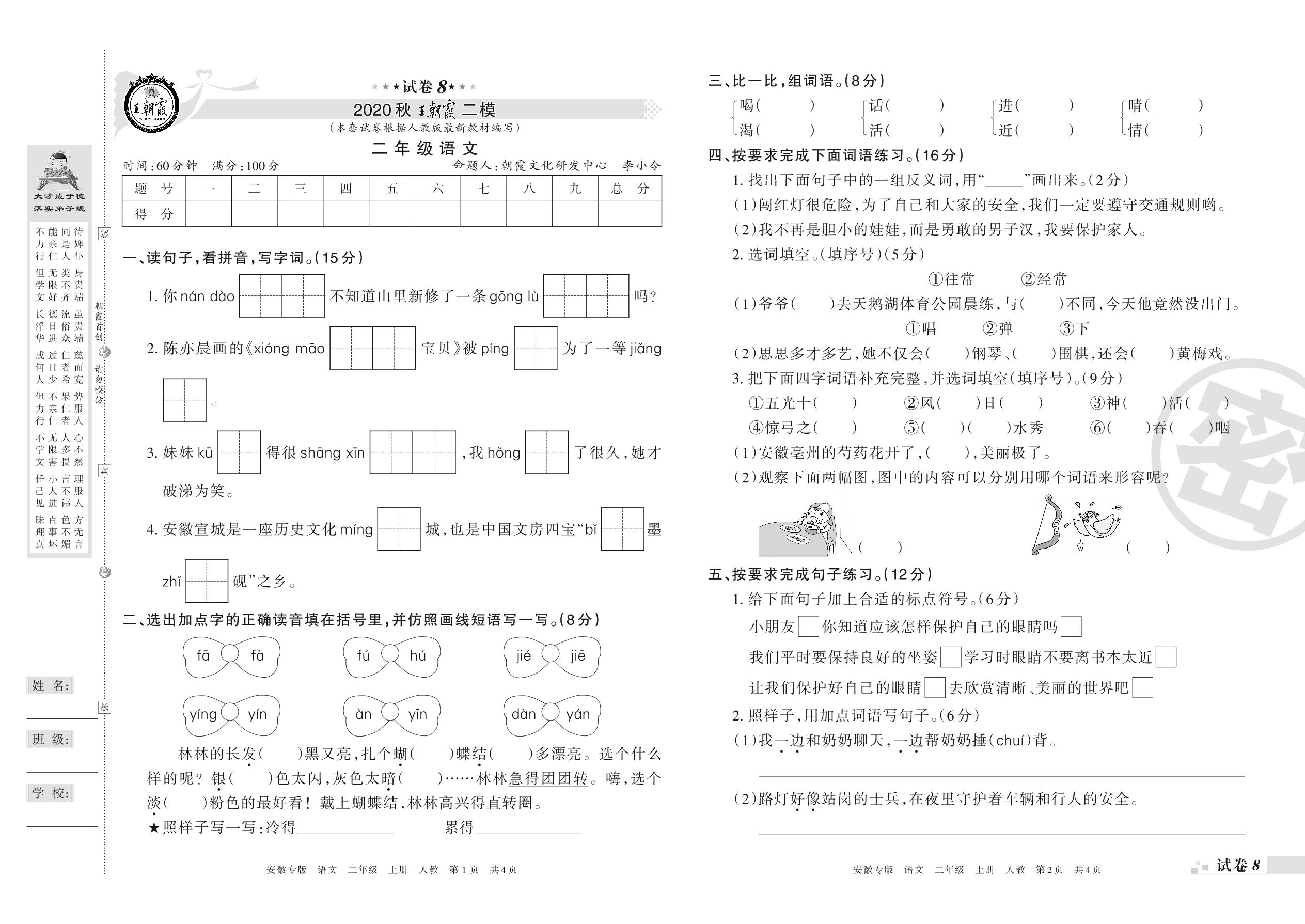 王朝霞期末模拟卷二年级上册语文(人教版)_R21080164934【8】