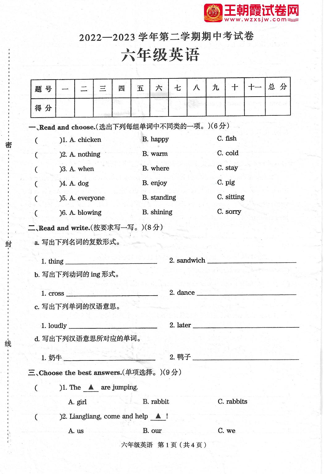 河南省周口市太康县(三起)2022—2023学年下学期4月期中试卷六年级英语(外研版)【无听力音频】