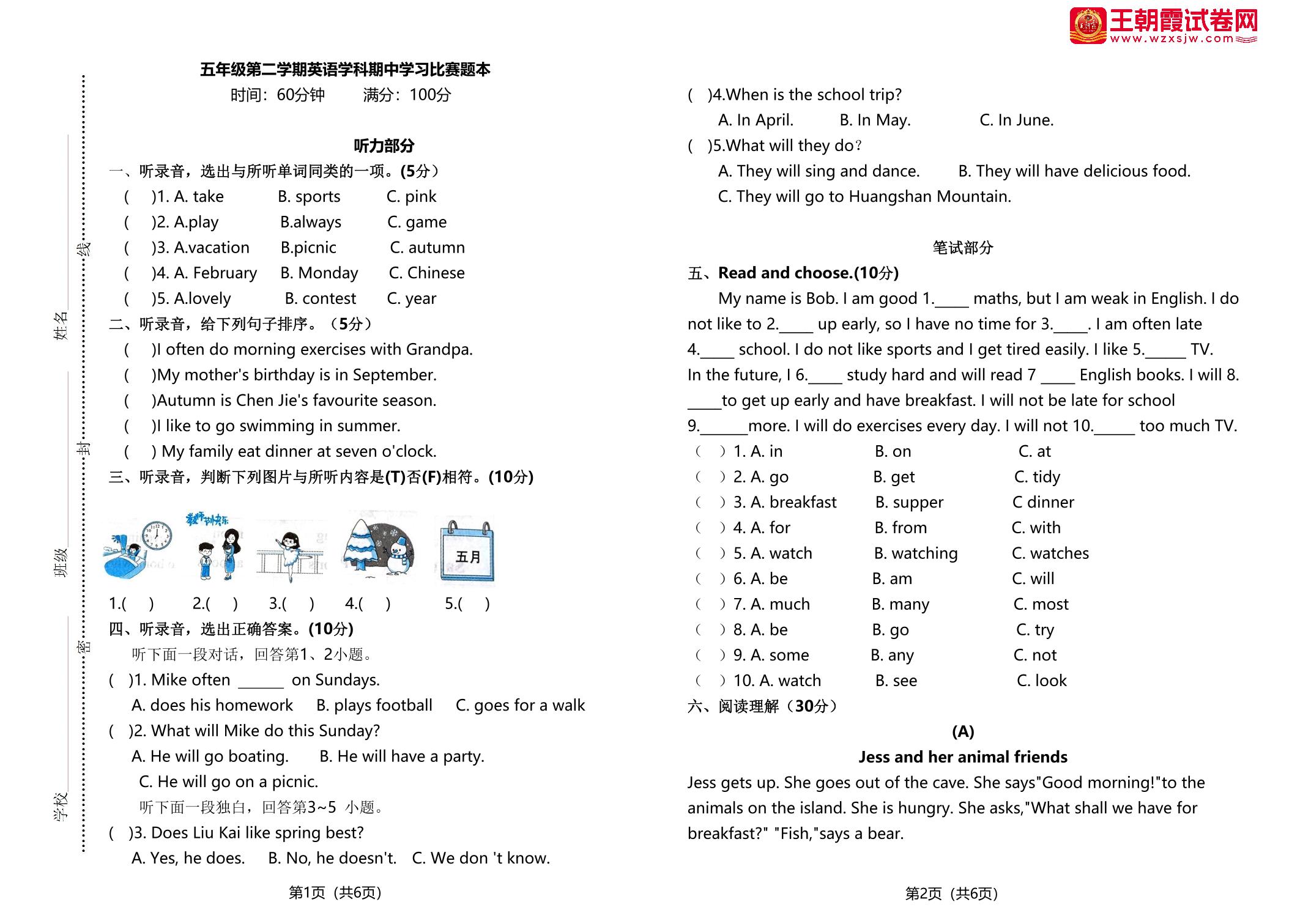 五年级英语人教PEP版(三起始)下册期中卷