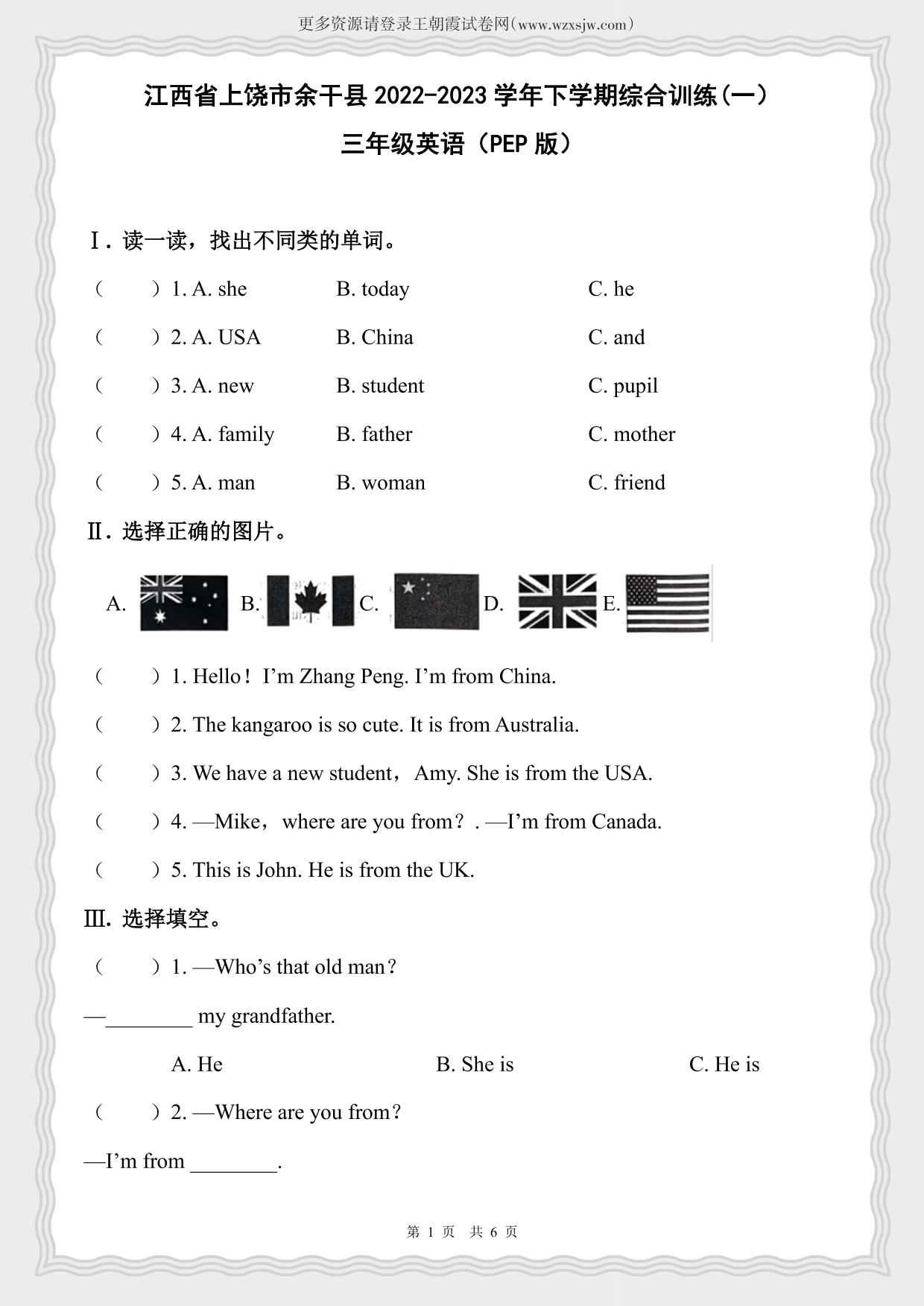 江西省上饶市余干县2022-2023学年下学期(月考)综合训练三年级英语(PEP版)