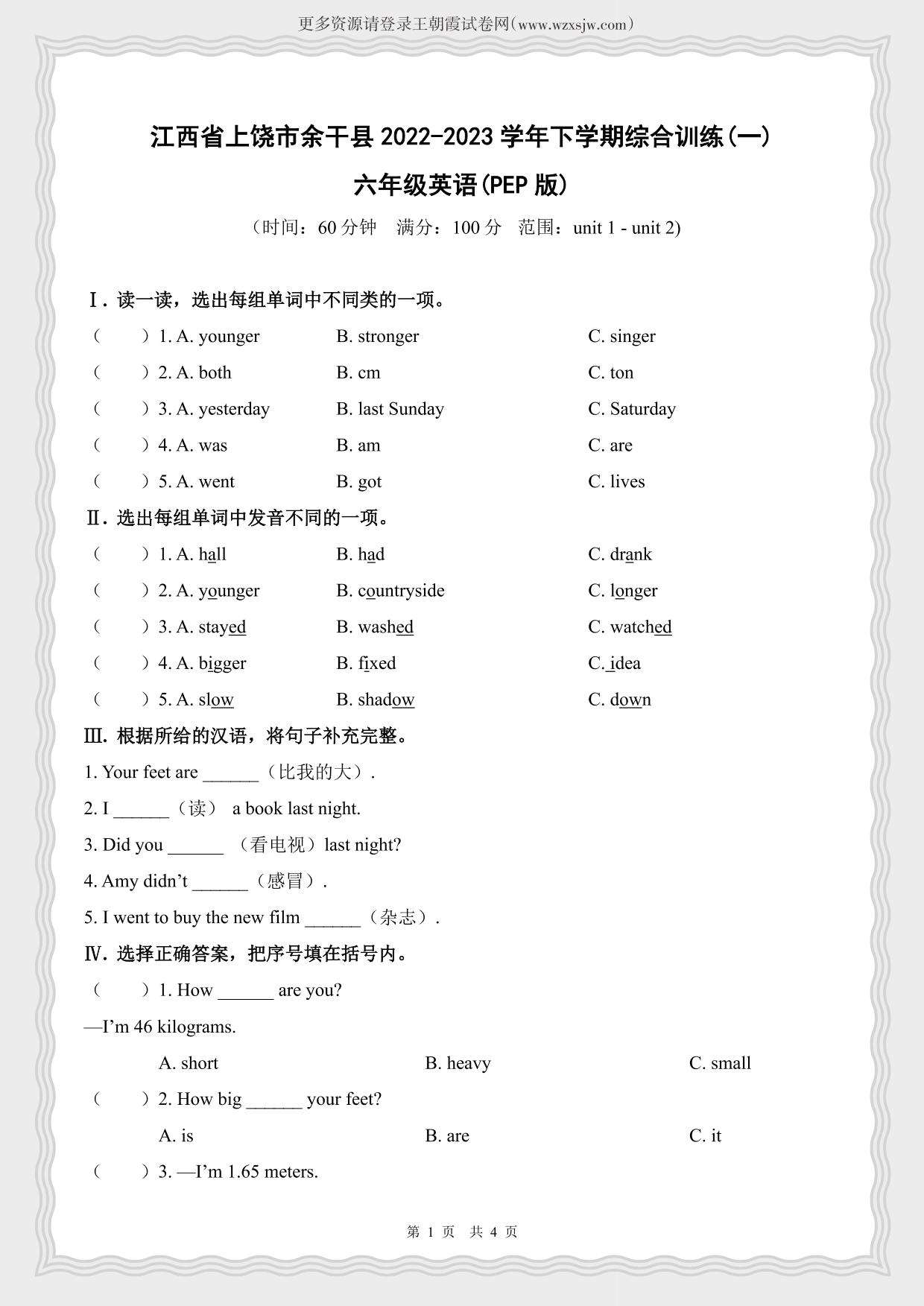 江西省上饶市余干县2022-2023学年下学期(月考)综合训练六年级英语(PEP版)