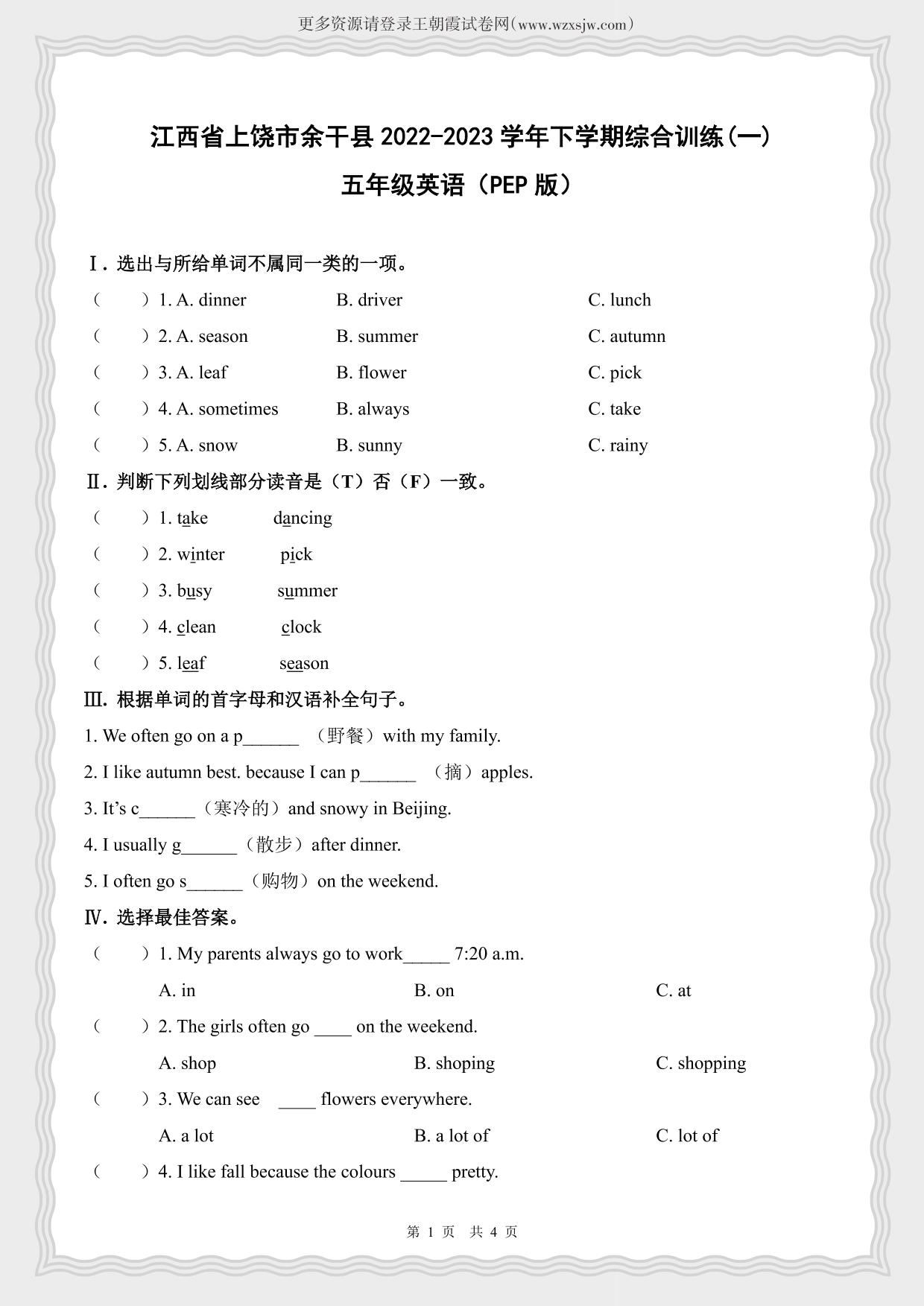 江西省上饶市余干县2022-2023学年下学期(月考)综合训练五年级英语(PEP版)