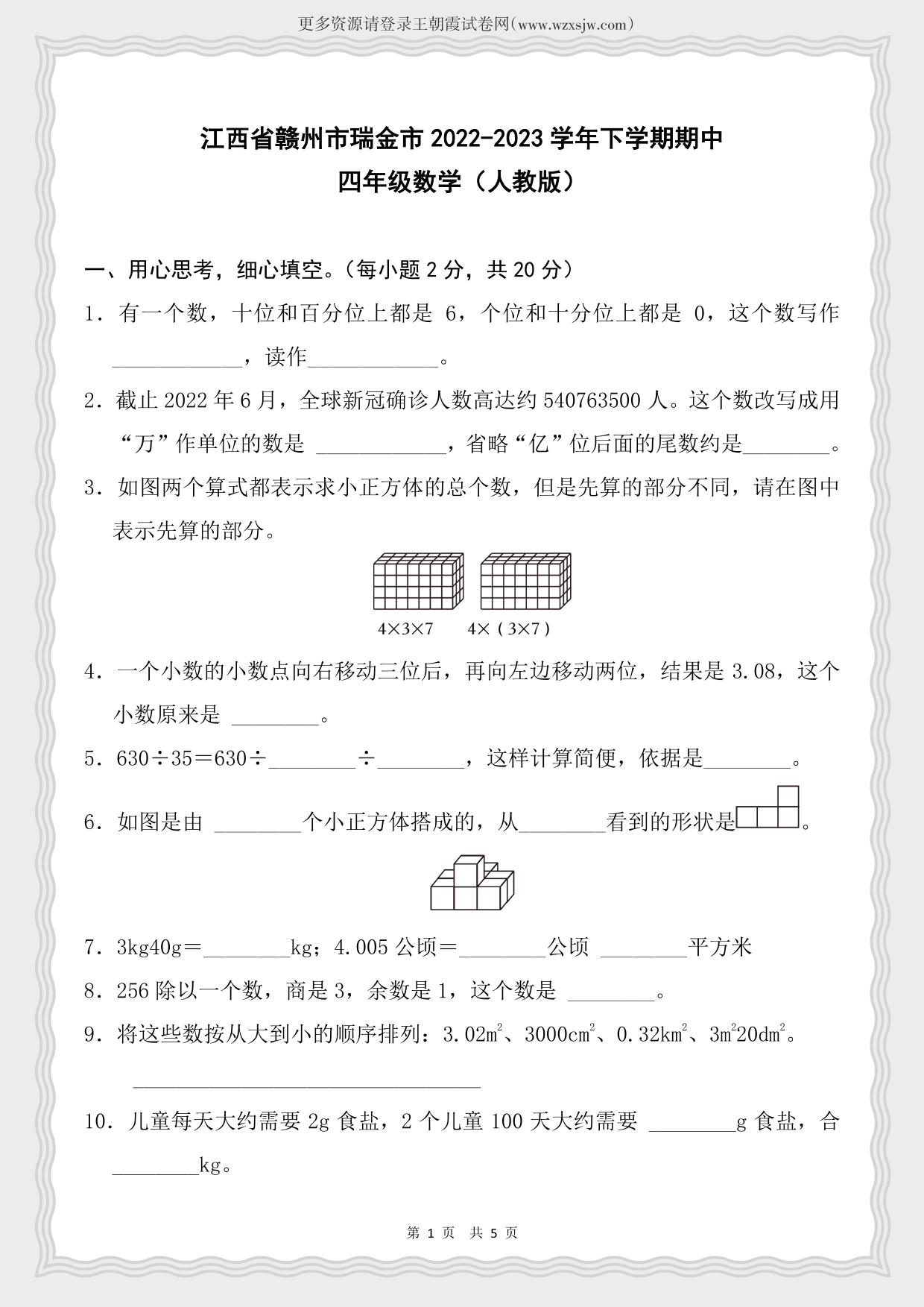 江西省赣州市瑞金市2022-2023学年下学期期中四年级数学(人教版)