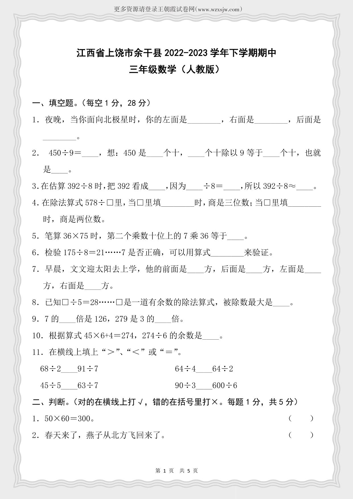 江西省上饶市余干县2022-2023学年下学期期中三年级数学(人教版)