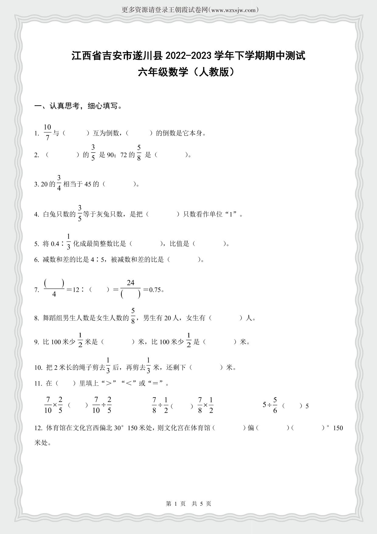 江西省吉安市遂川县2022-2023学年下学期期中测试六年级数学(人教版)