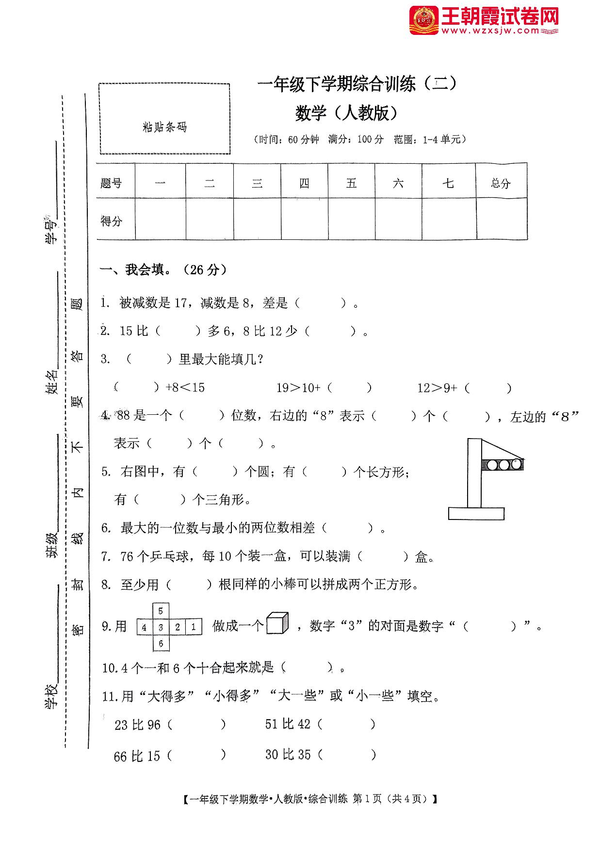 一年级数学人教版下册期中卷