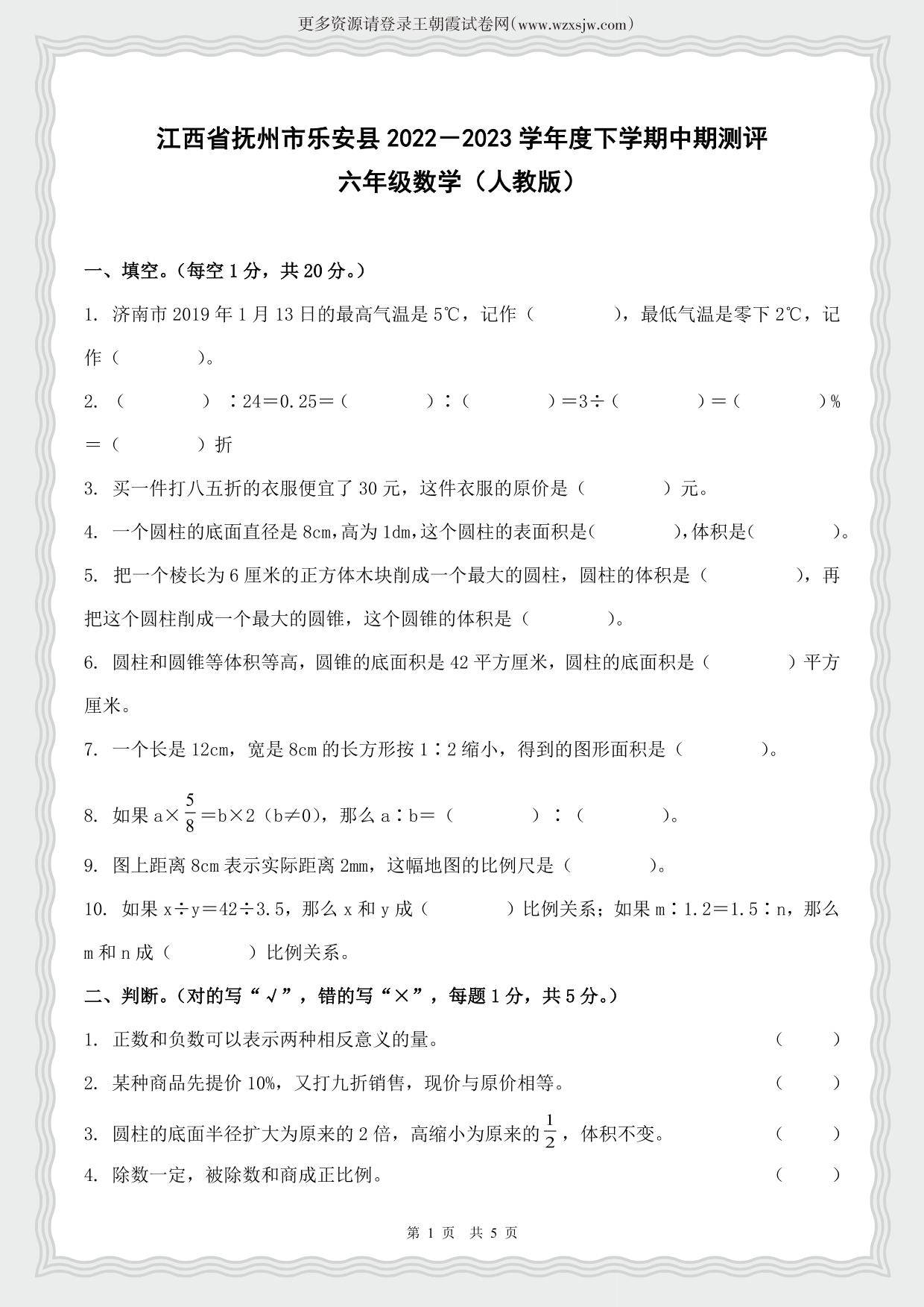 江西省抚州市乐安县2022-2023学年度下学期中期测评六年级数学(人教版)