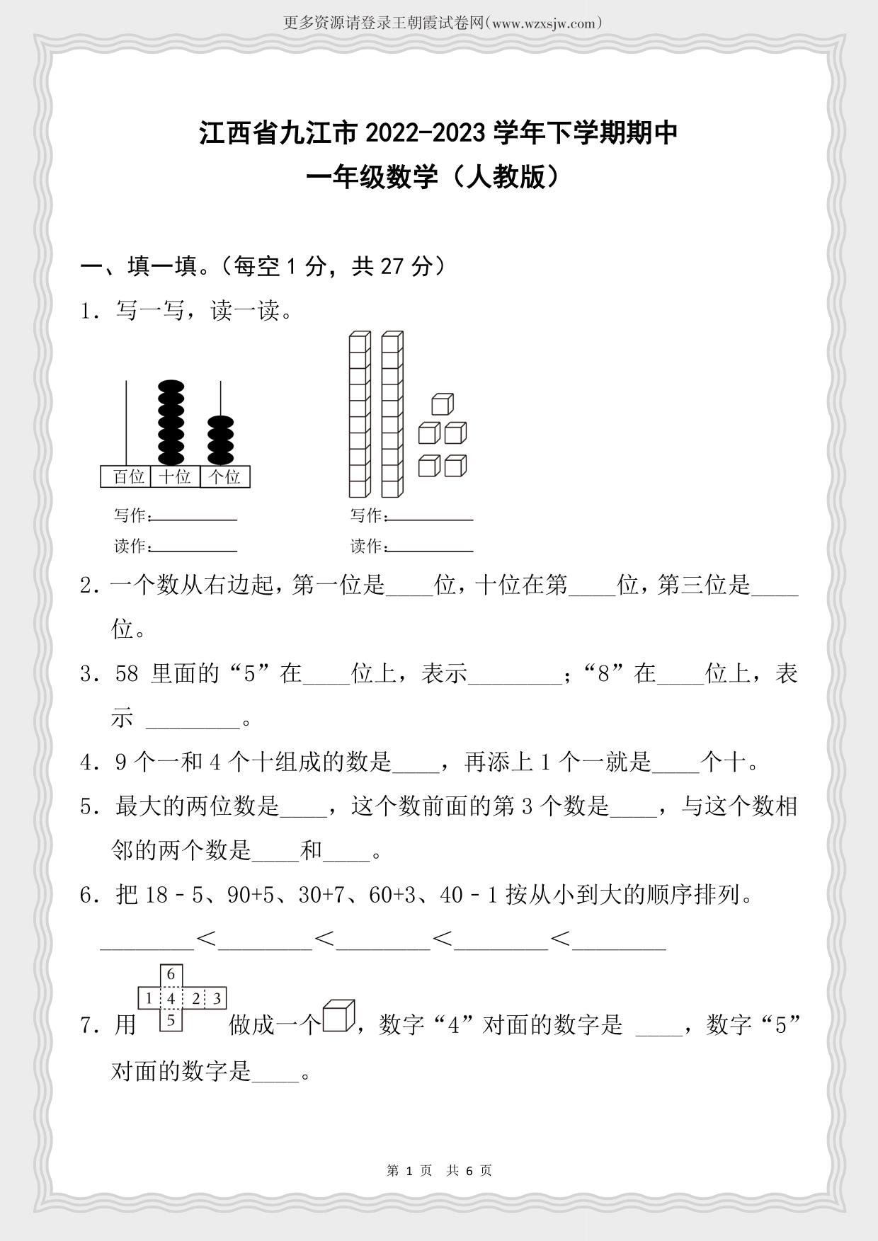 江西省九江市2022-2023学年下学期期中一年级数学(人教版)