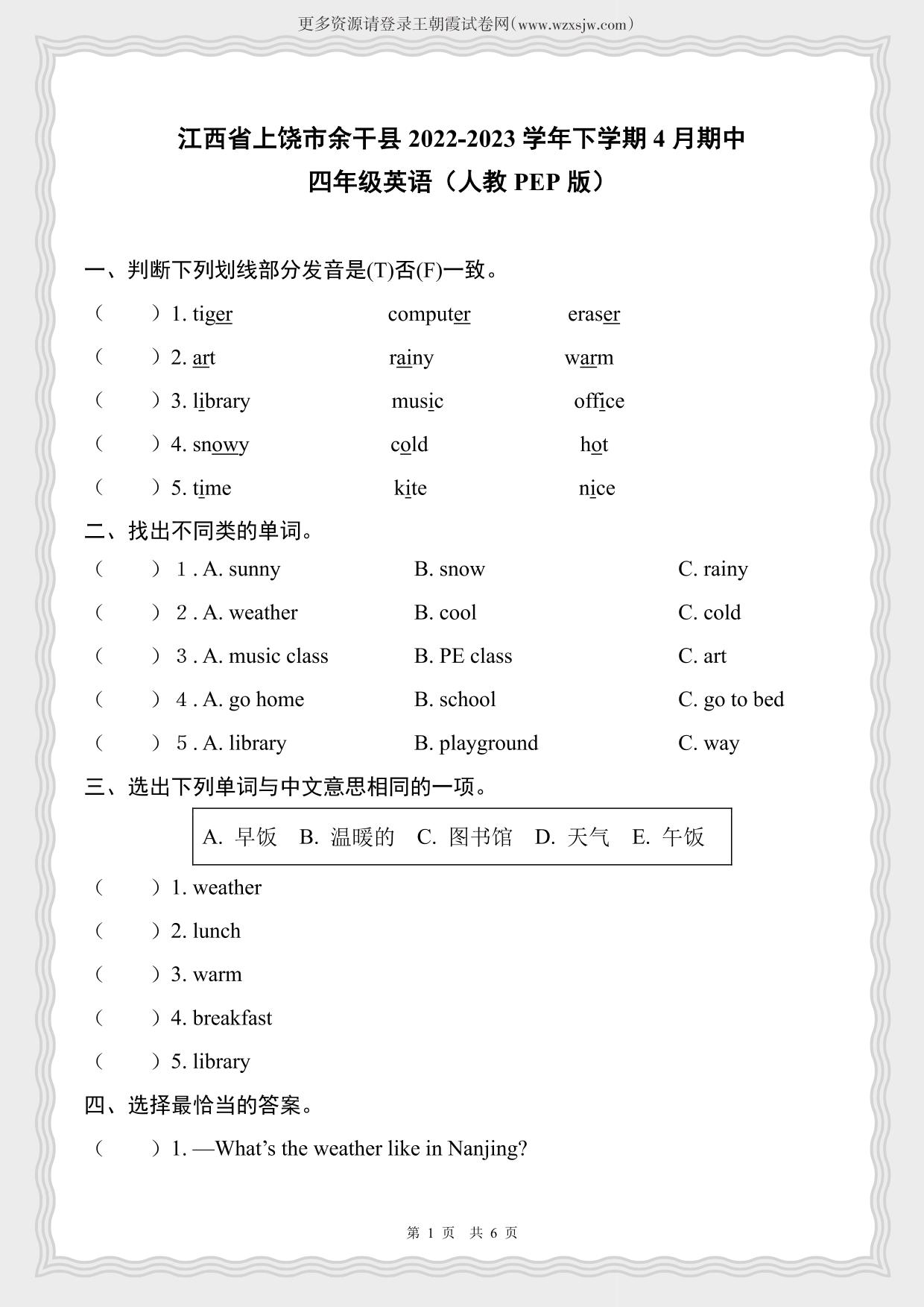 江西省上饶市余干县2022-2023学年下学期4月期中四年级英语(人教PEP版)