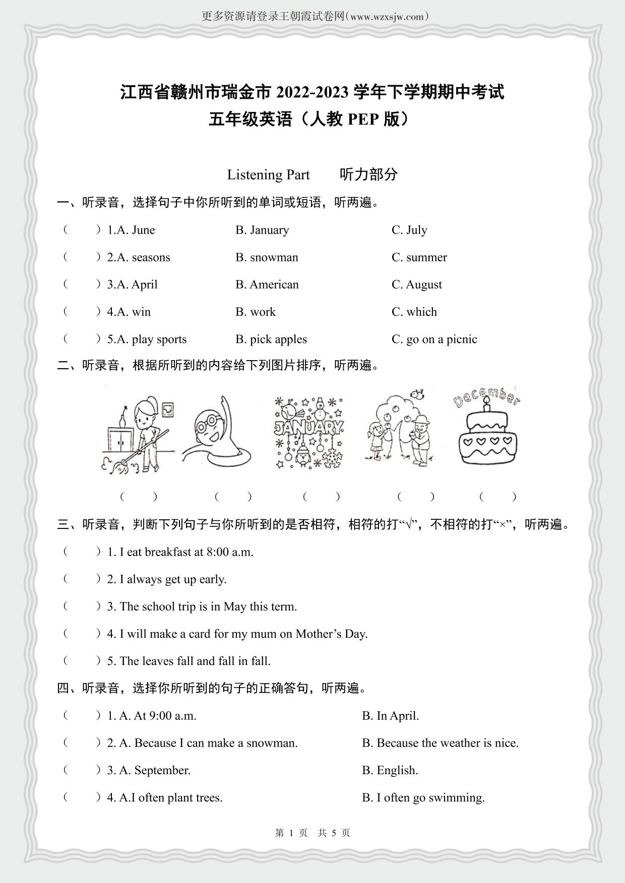 江西省赣州市瑞金市2022-2023学年下学期期中考试五年级英语(人教PEP版)【无听力音频】