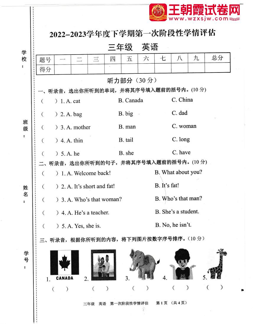三年级英语人教PEP版(三起始)下册期中卷