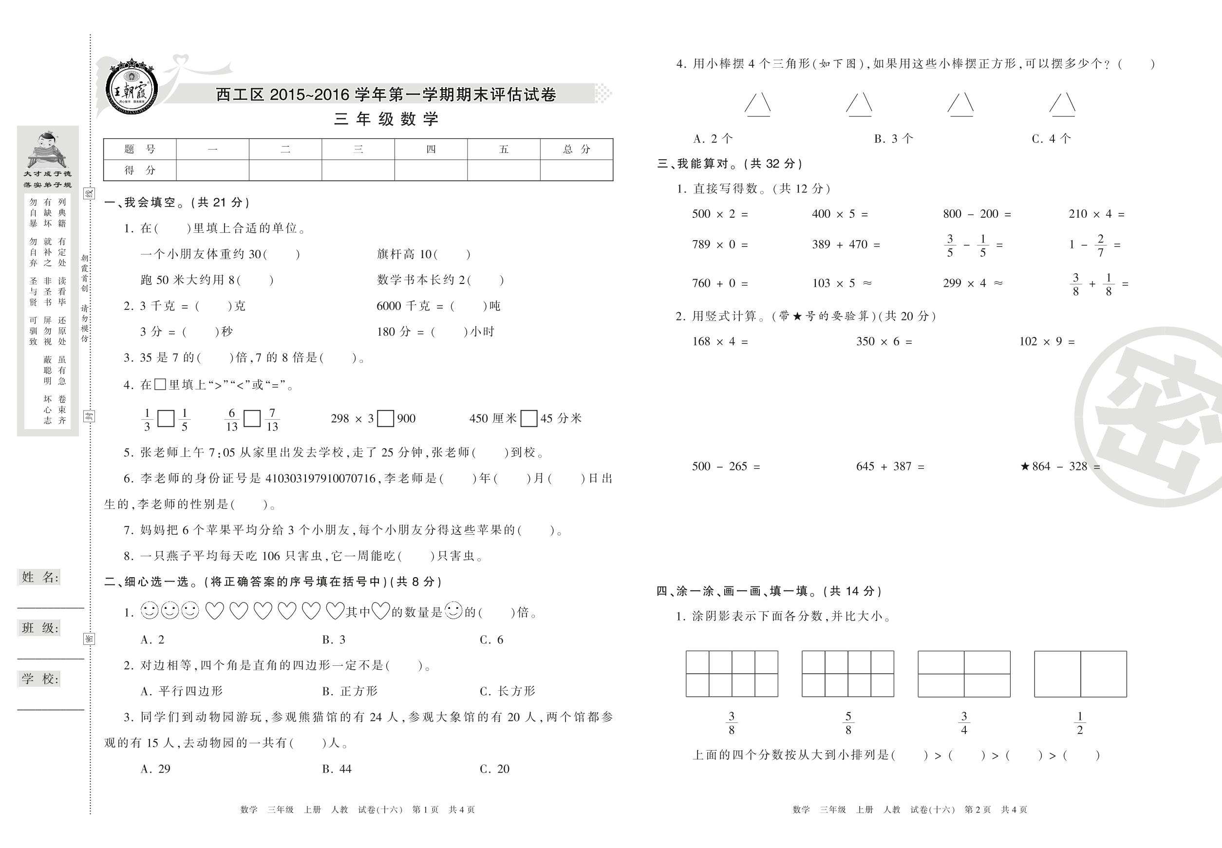 2015-2016学年第一学期洛阳市西工区三年级数学试卷(人教版)【16】