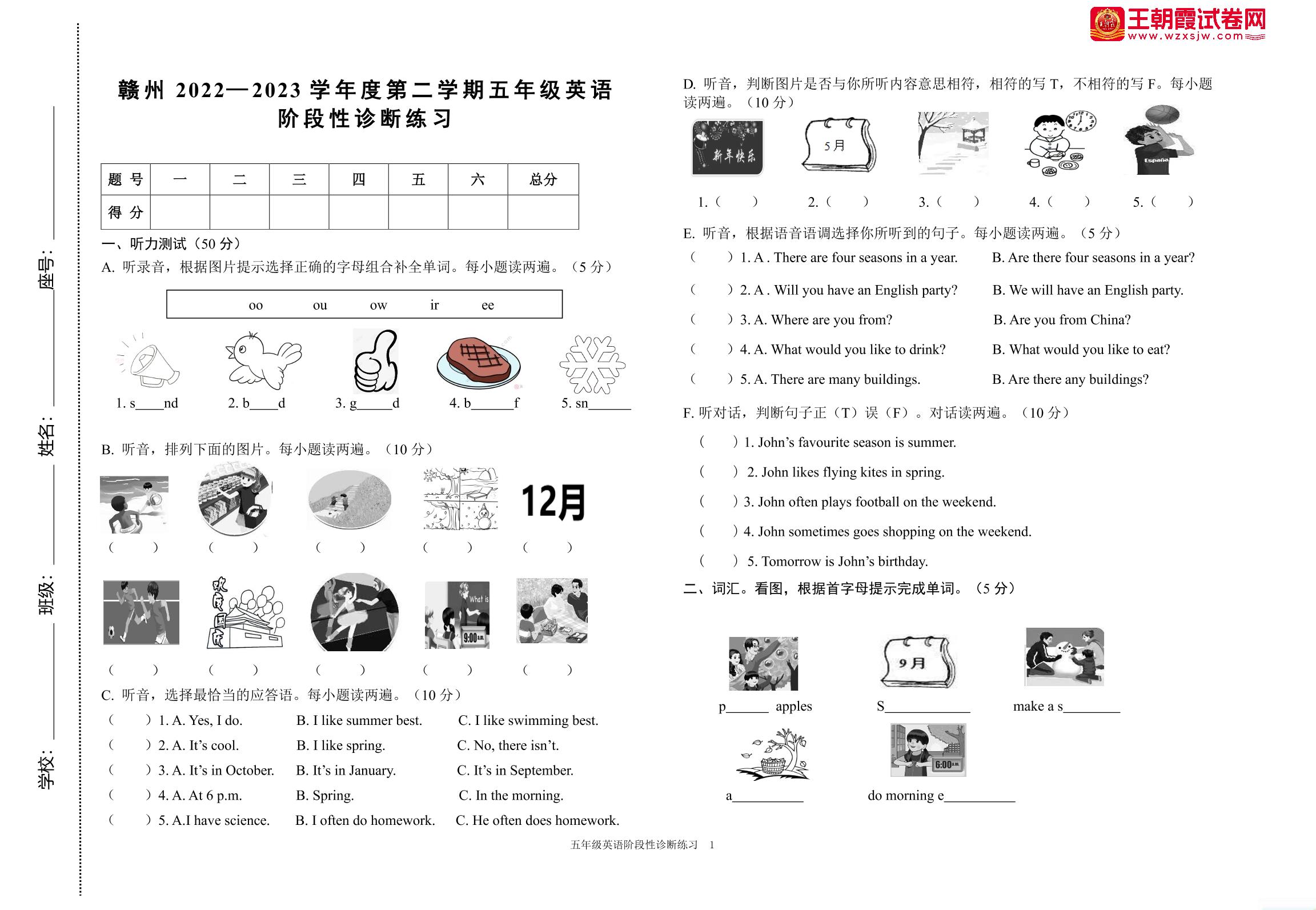 江西省赣州市2022-2023学年度第二学期期中阶段性诊断练习五年级英语(人教PEP版)