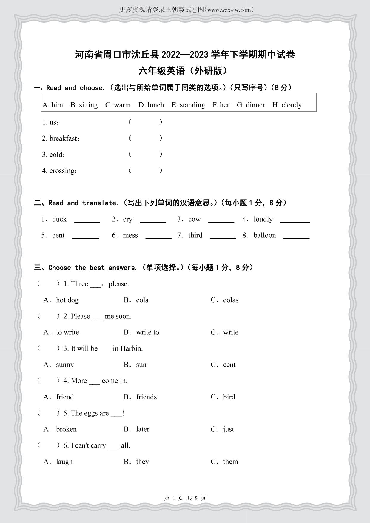 河南省周口市沈丘县2022—2023学年下学期期中试卷六年级英语(外研版)【无听力音频】