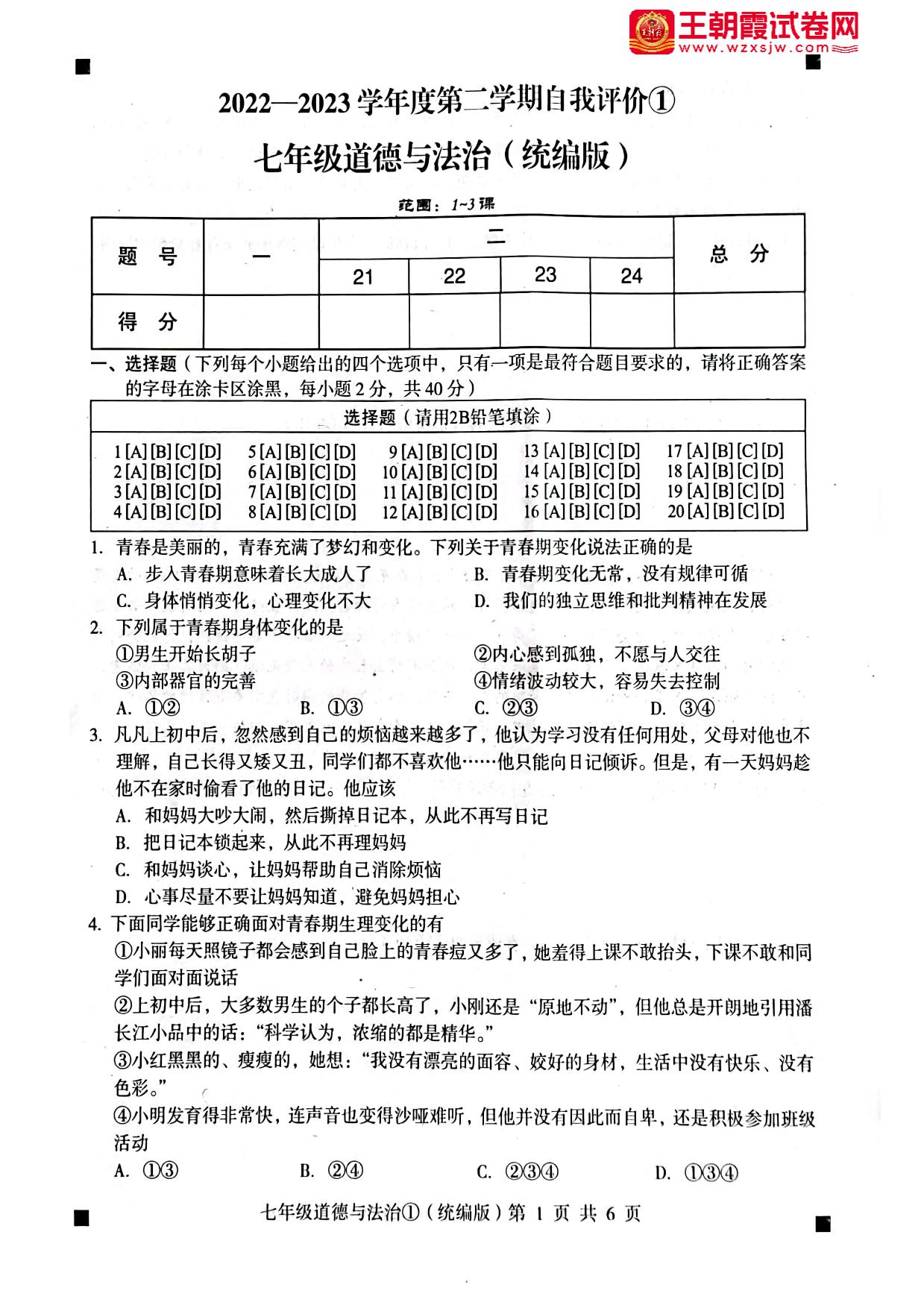 河北省石家庄市赵县2022-2023学年第二学期自我评价①3月月考七年级道德与法治(人教版)