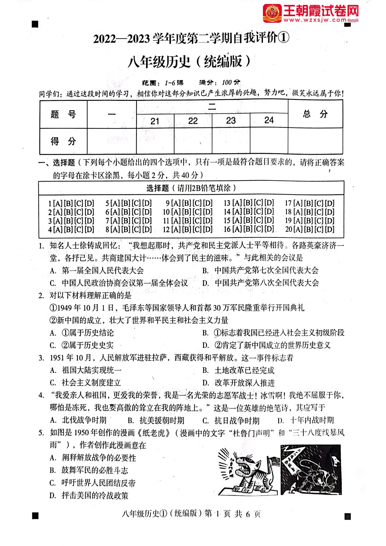 河北省石家庄市赵县2022-2023学年第二学期自我评价①3月月考八年级历史(人教版)