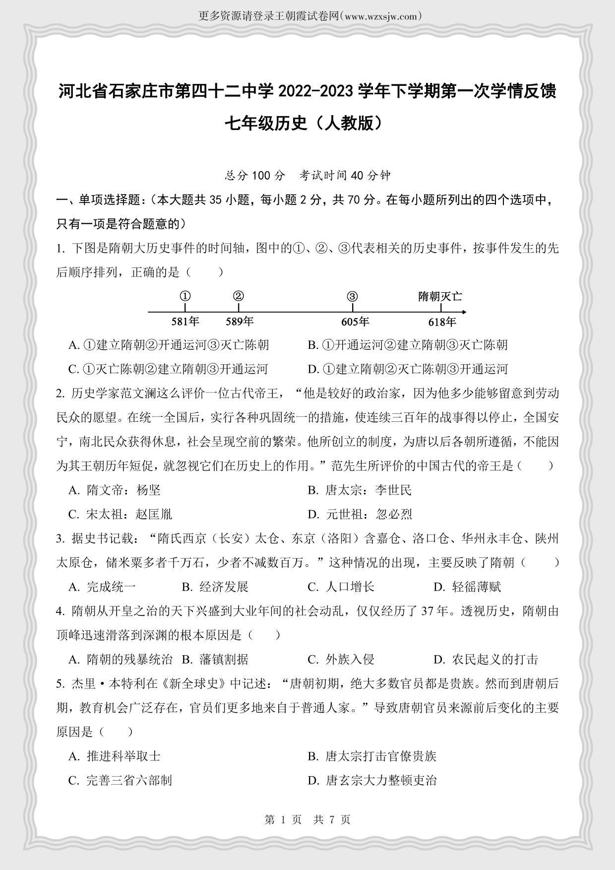 河北省石家庄市第四十二中学2022-2023学年下学期第一次学情反馈3月月考七年级历史(人教版)