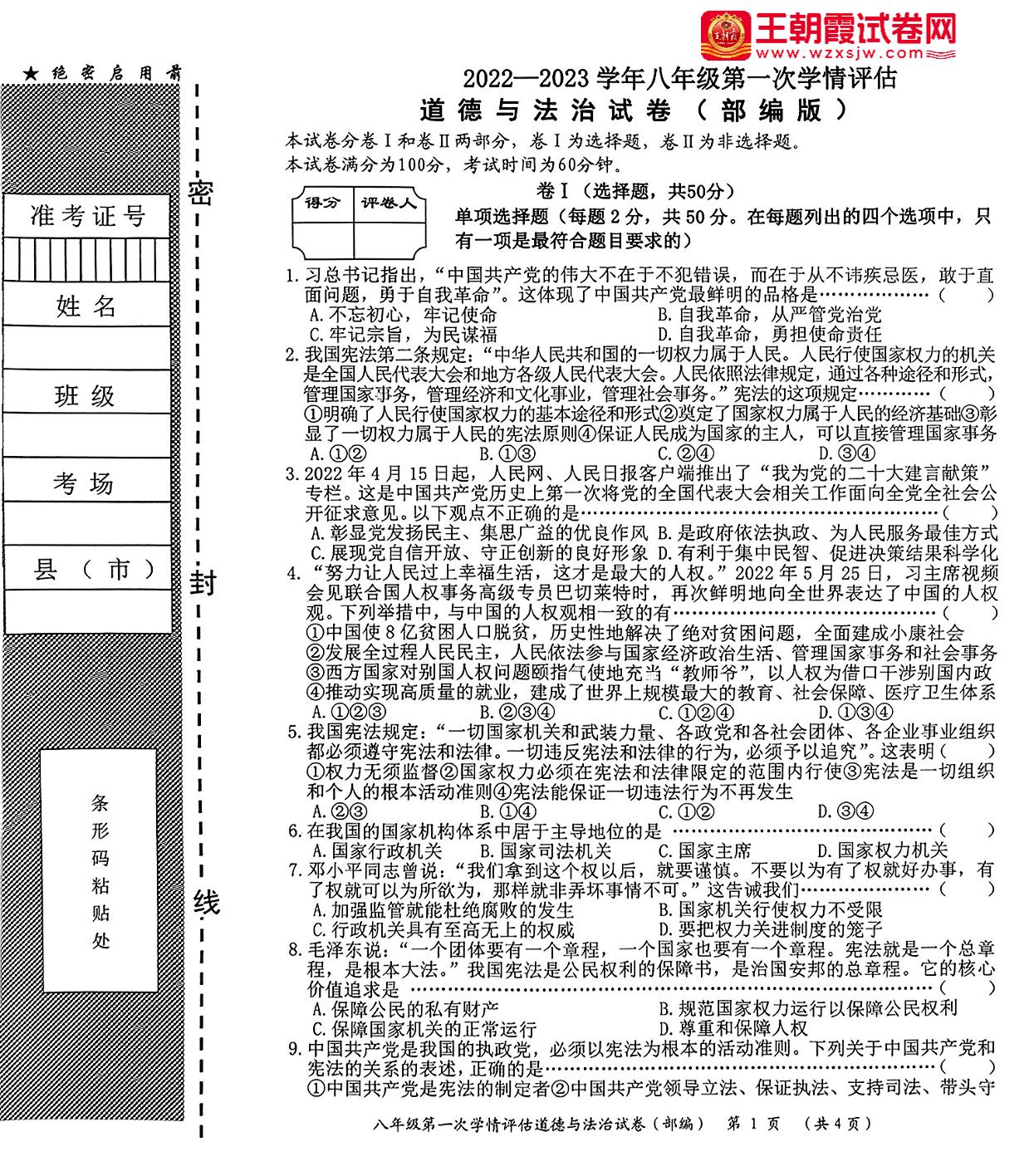 八年级道德与法治人教版下册月考卷