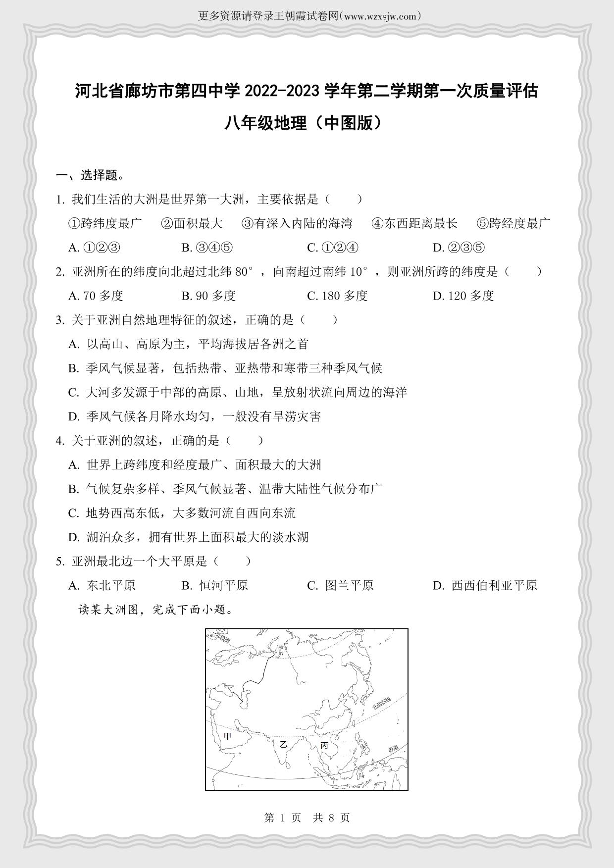 河北省廊坊市第四中学2022-2023学年第二学期第一次质量评估3月月考八年级地理(中图版)
