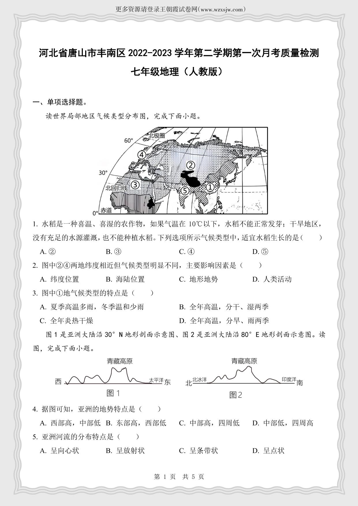 河北省唐山市丰南区2022-2023学年第二学期第一次月考质量检测七年级地理(人教版)