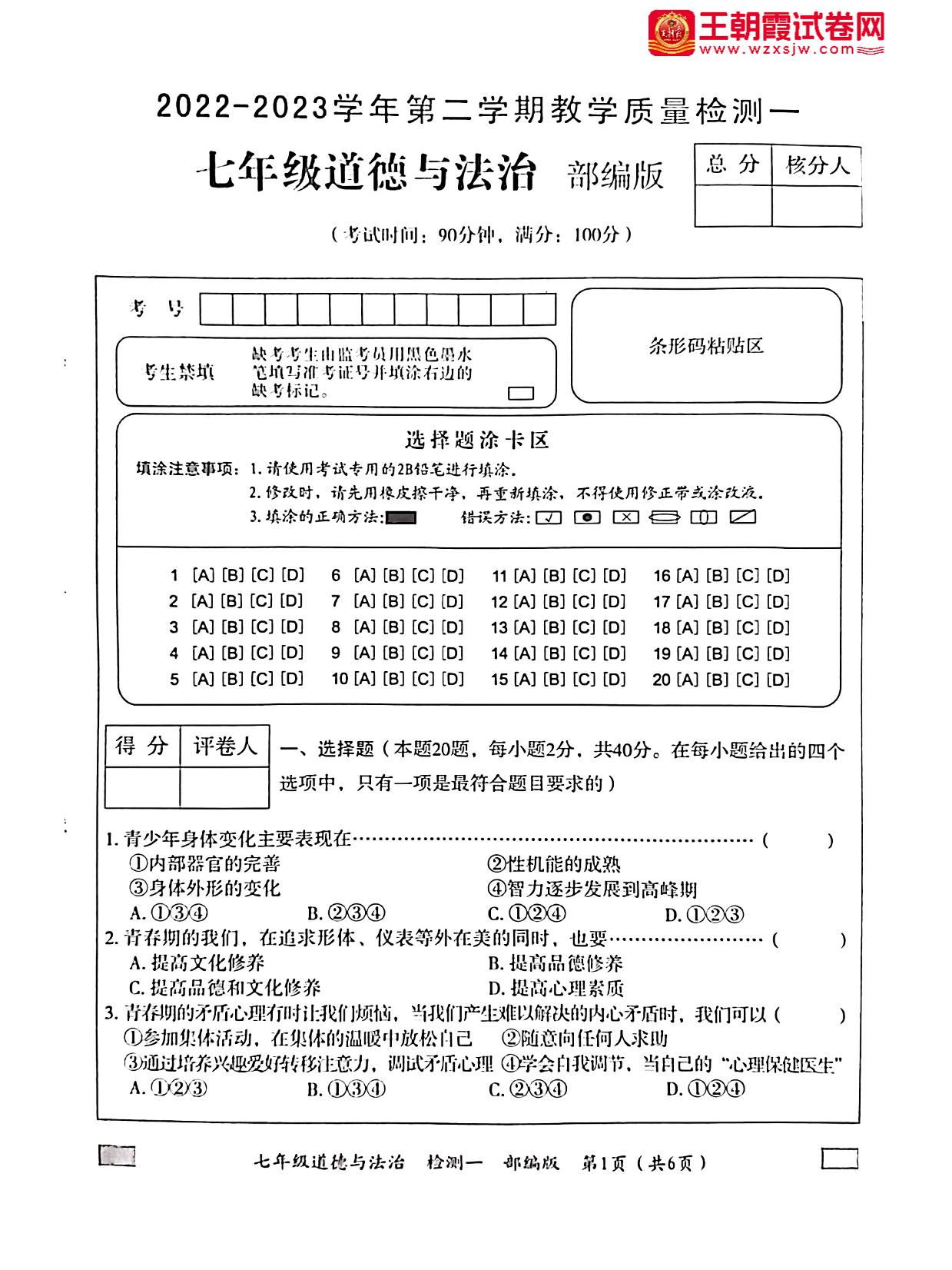 河北省沧州市南皮县桂和中学2022-2023学年第二学期教学质量检测一第一次月考试题七年级道德与法治(人教版)