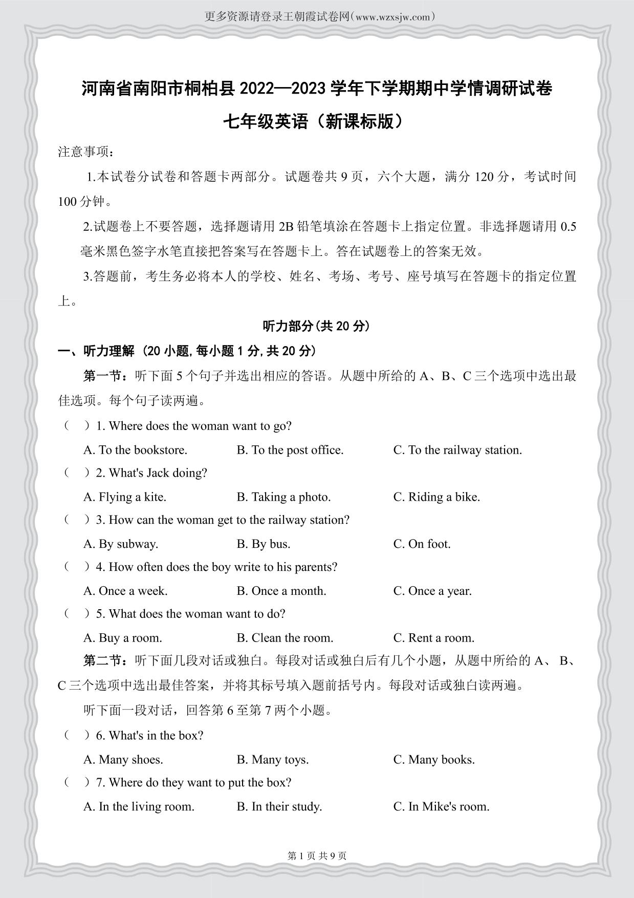 河南省南阳市桐柏县2022—2023学年下学期期中学情调研试卷七年级英语(新课标版)【无听力音频】