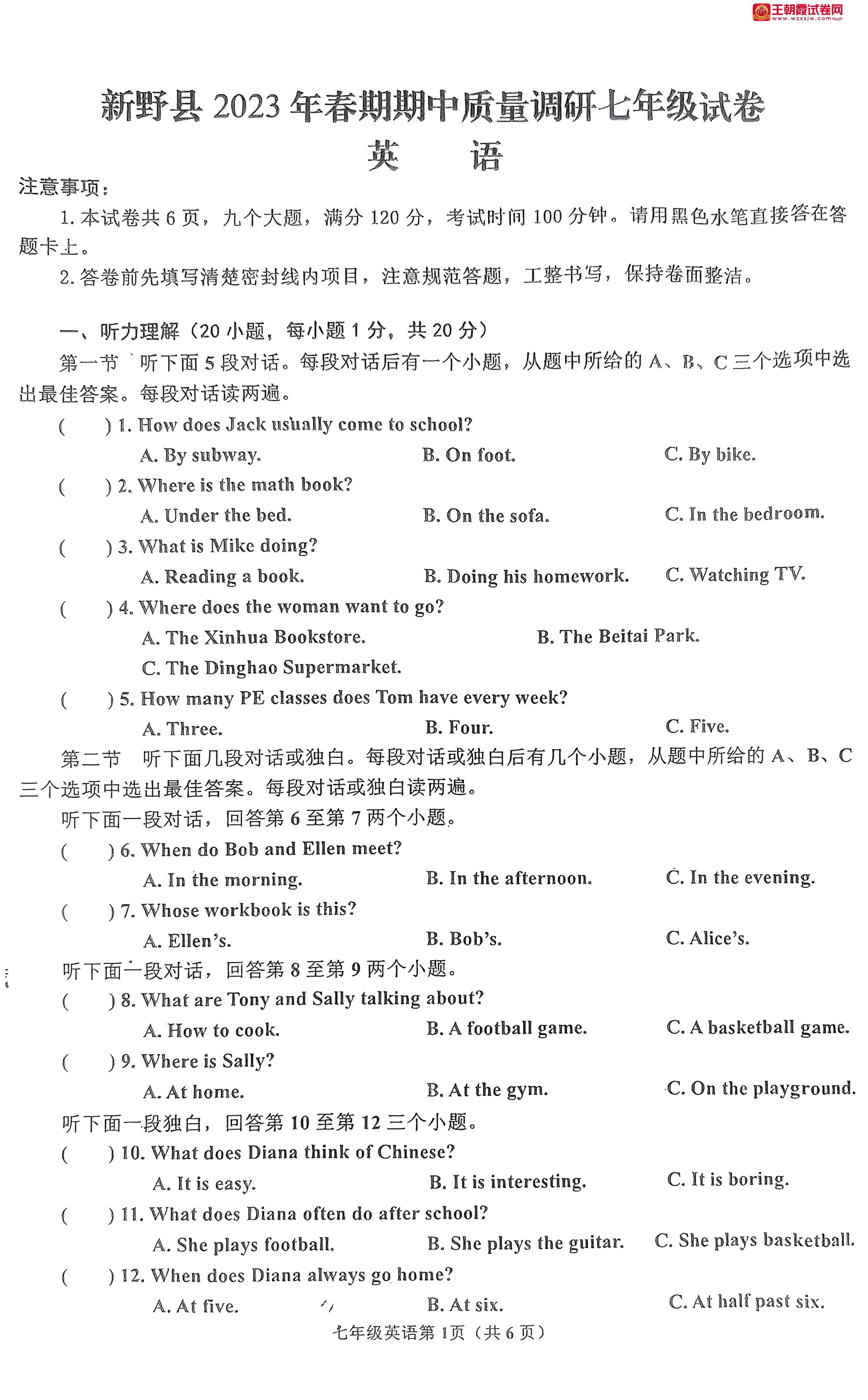 河南省南阳市新野县2022—2023学年下学期4月期中试题七年级英语(新课标版)