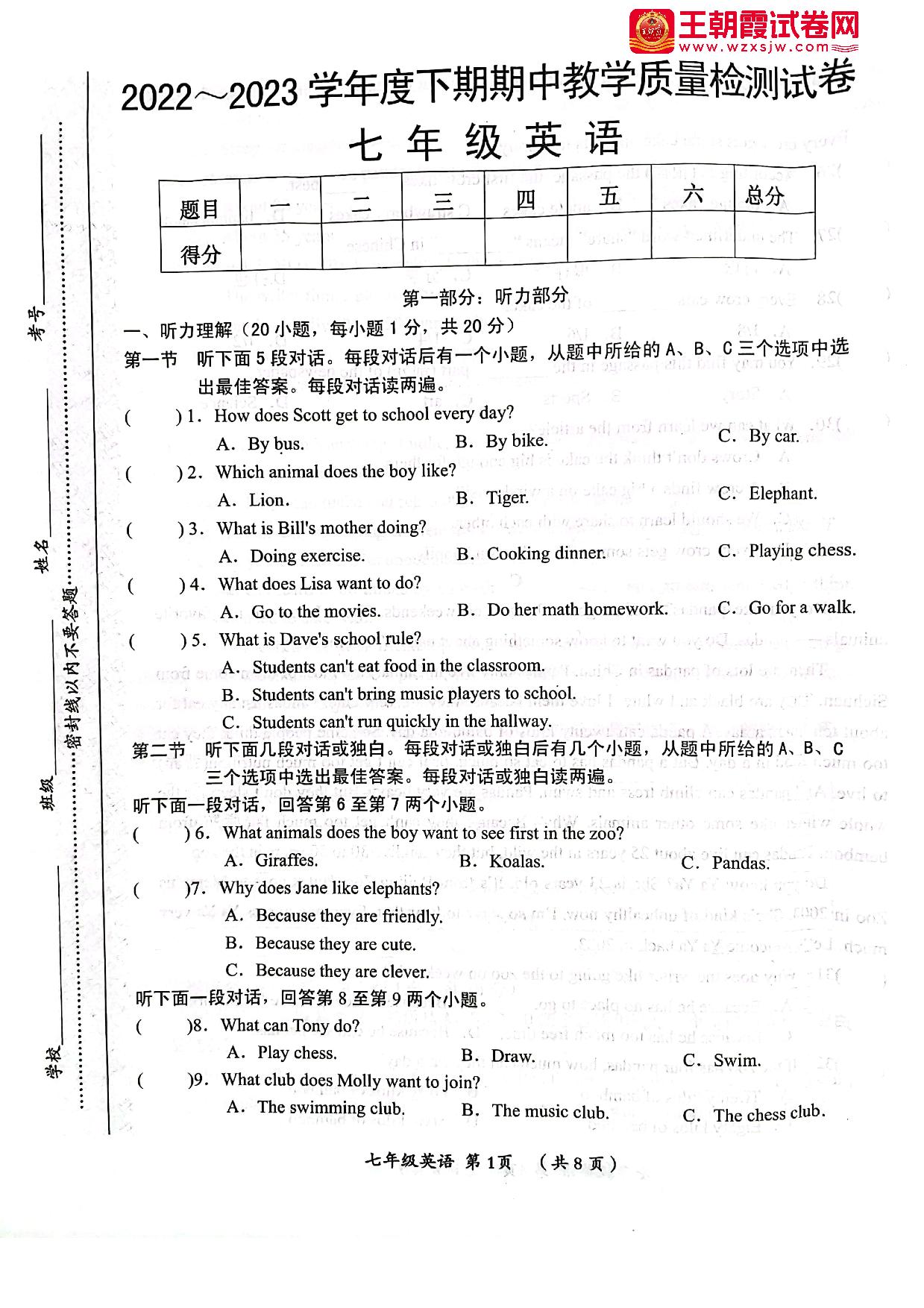 河南省漯河市郾城区2022—2023学年下学期4月期中试题七年级英语(新课标版)【无听力音频】