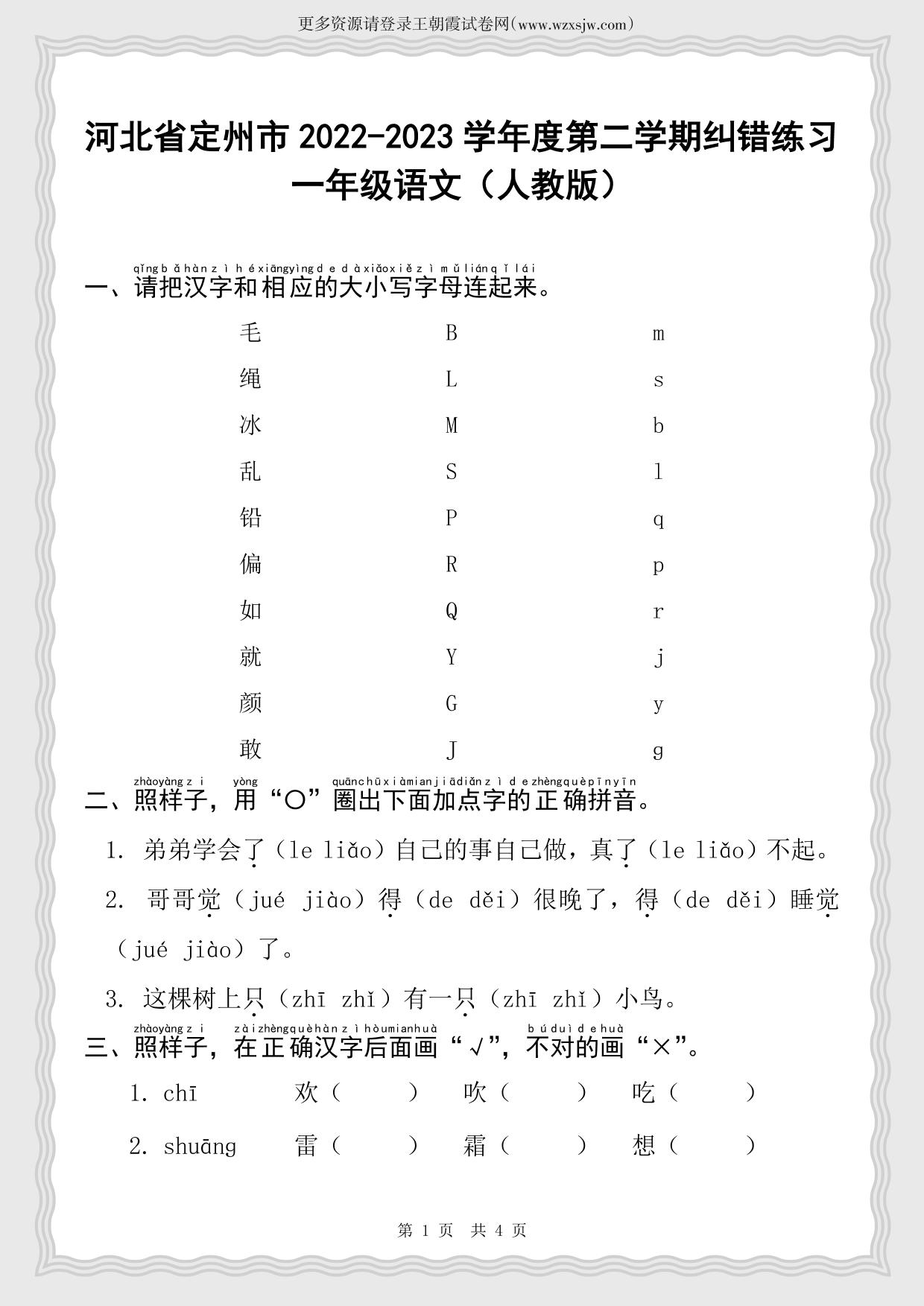 河北省保定市定州市2022-2023学年度第二学期纠错练习期中试题一年级语文(人教版)