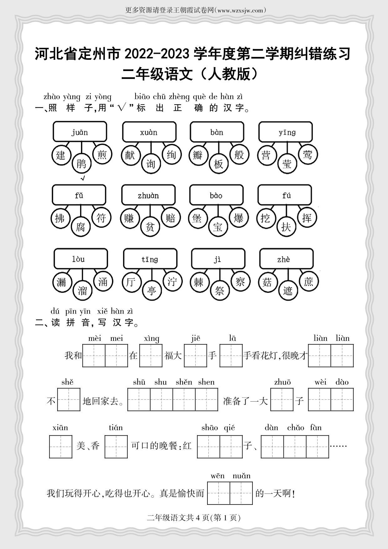 河北省保定市定州市2022-2023学年度第二学期纠错练习期中试题二年级语文(人教版)
