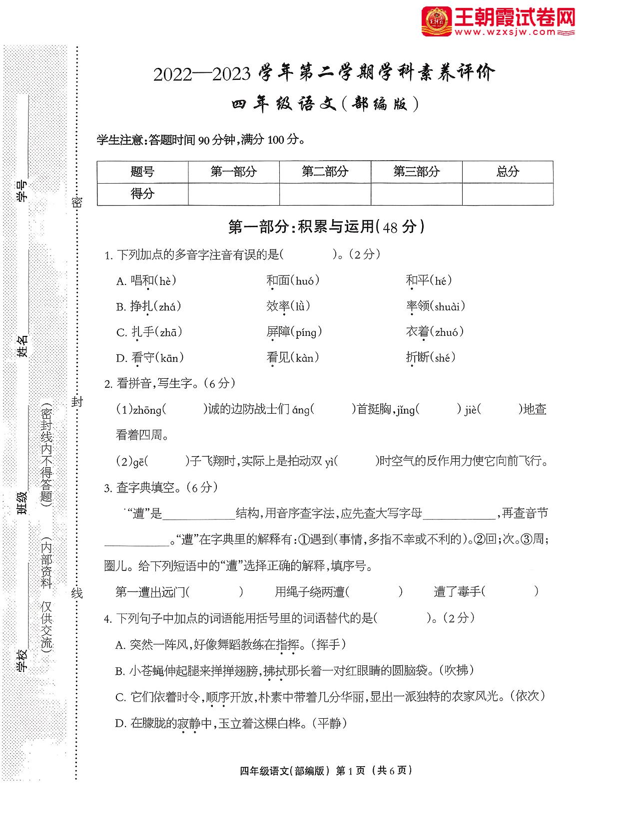 河北省保定市阜平县2022-2023学年第二学期期中学科素养评价四年级语文(人教版)