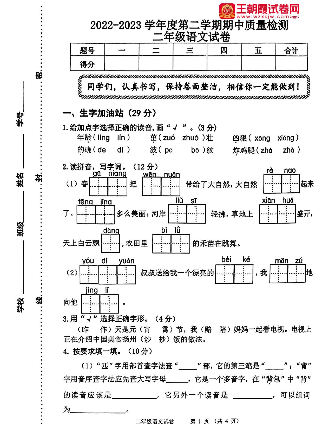 河北省秦皇岛市抚宁区2022-2023学年度第二学期期中质量检测试卷二年级语文(人教版)