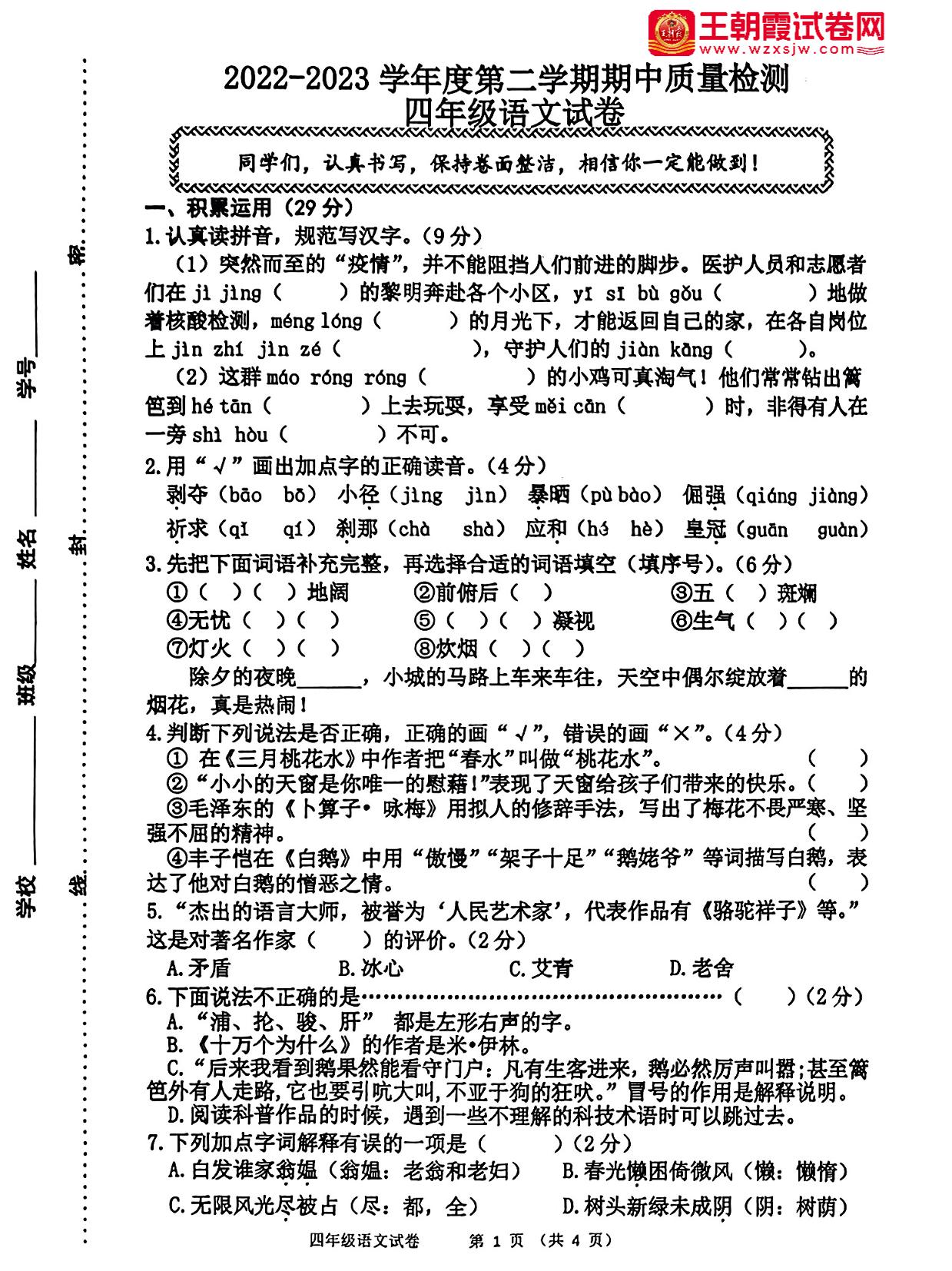 河北省秦皇岛市抚宁区2022-2023学年度第二学期期中质量检测试卷四年级语文(人教版)