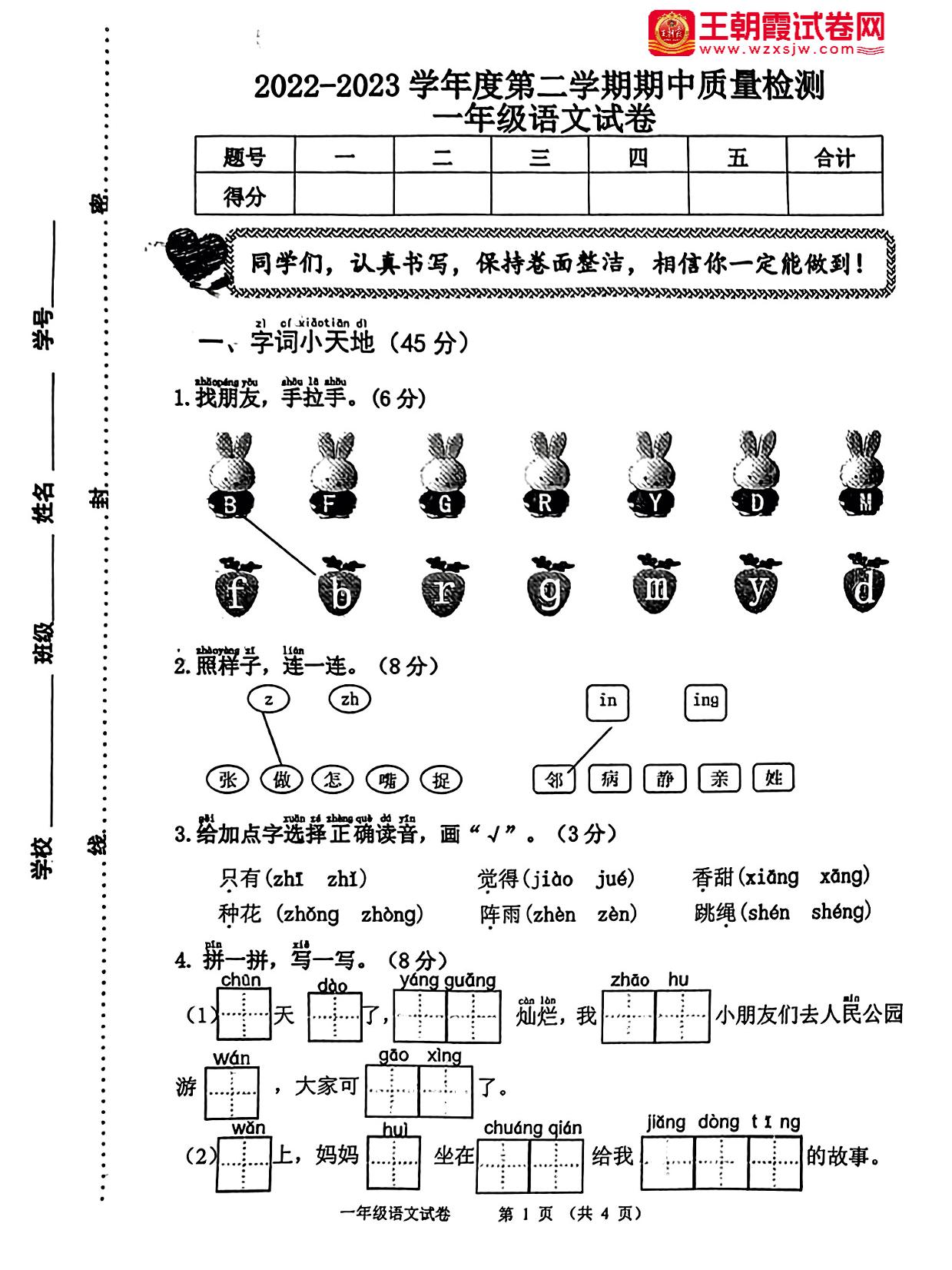 河北省秦皇岛市抚宁区2022-2023学年度第二学期期中质量检测试卷一年级语文(人教版)