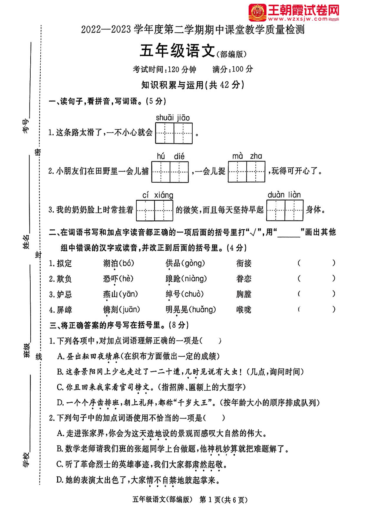 河北省廊坊市霸州市2022-2023学年度第二学期期中课堂教学质量检测五年级语文(人教版)