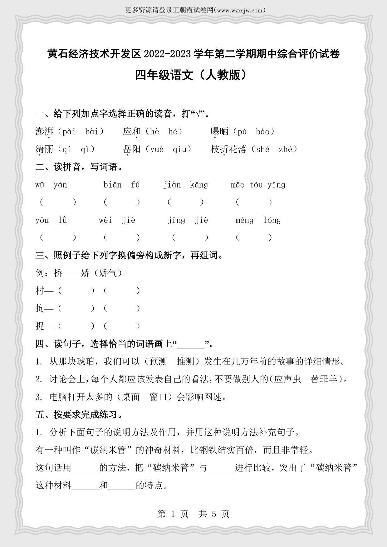 湖北省黄石经济技术开发区2022-2023学年第二学期期中综合评价试卷四年级语文(人教版)