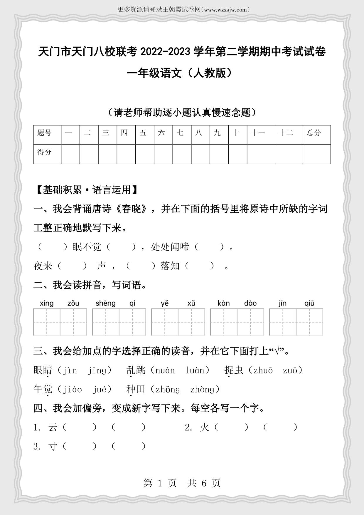 湖北省天门市天门八校联考2022-2023学年第二学期期中考试试卷一年级语文(人教版)