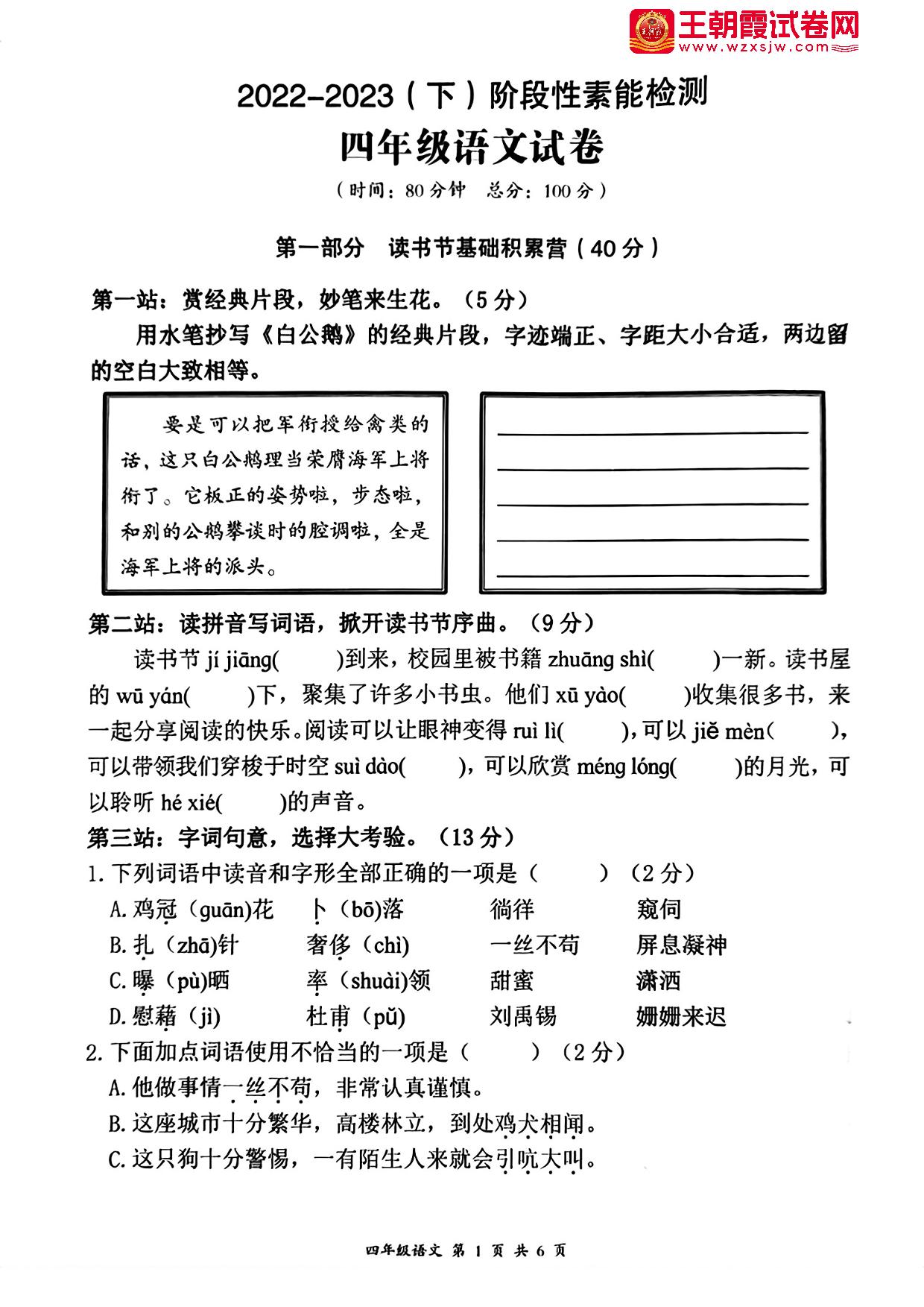 四年级语文人教版下册期中卷