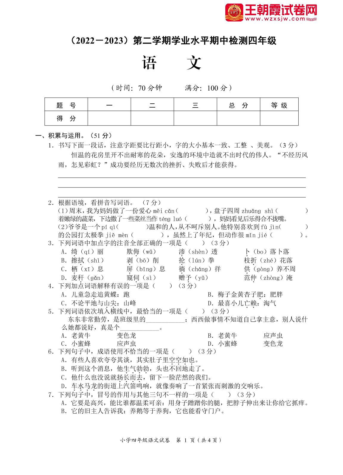 湖北省孝感市应城市2022-2023学年第二学期期中教学过程性评价试题四年级语文(人教版)