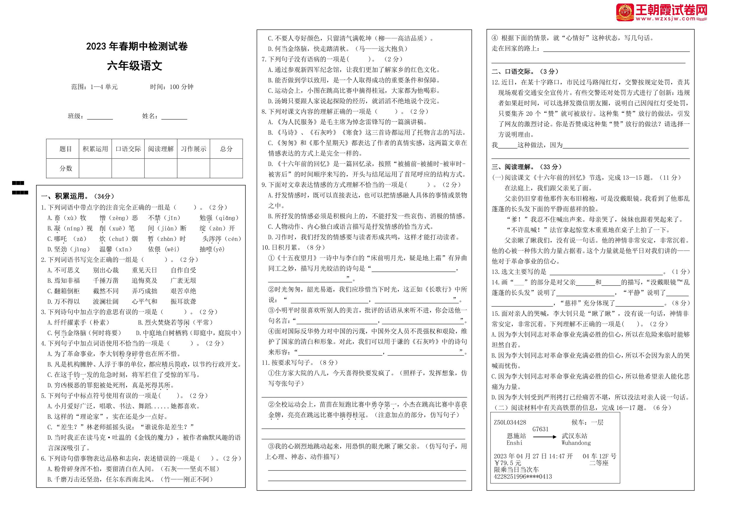 湖北省恩施土家族苗族自治州宣恩县2022-2023学年第二学期4月期中试题六年级语文(人教版)