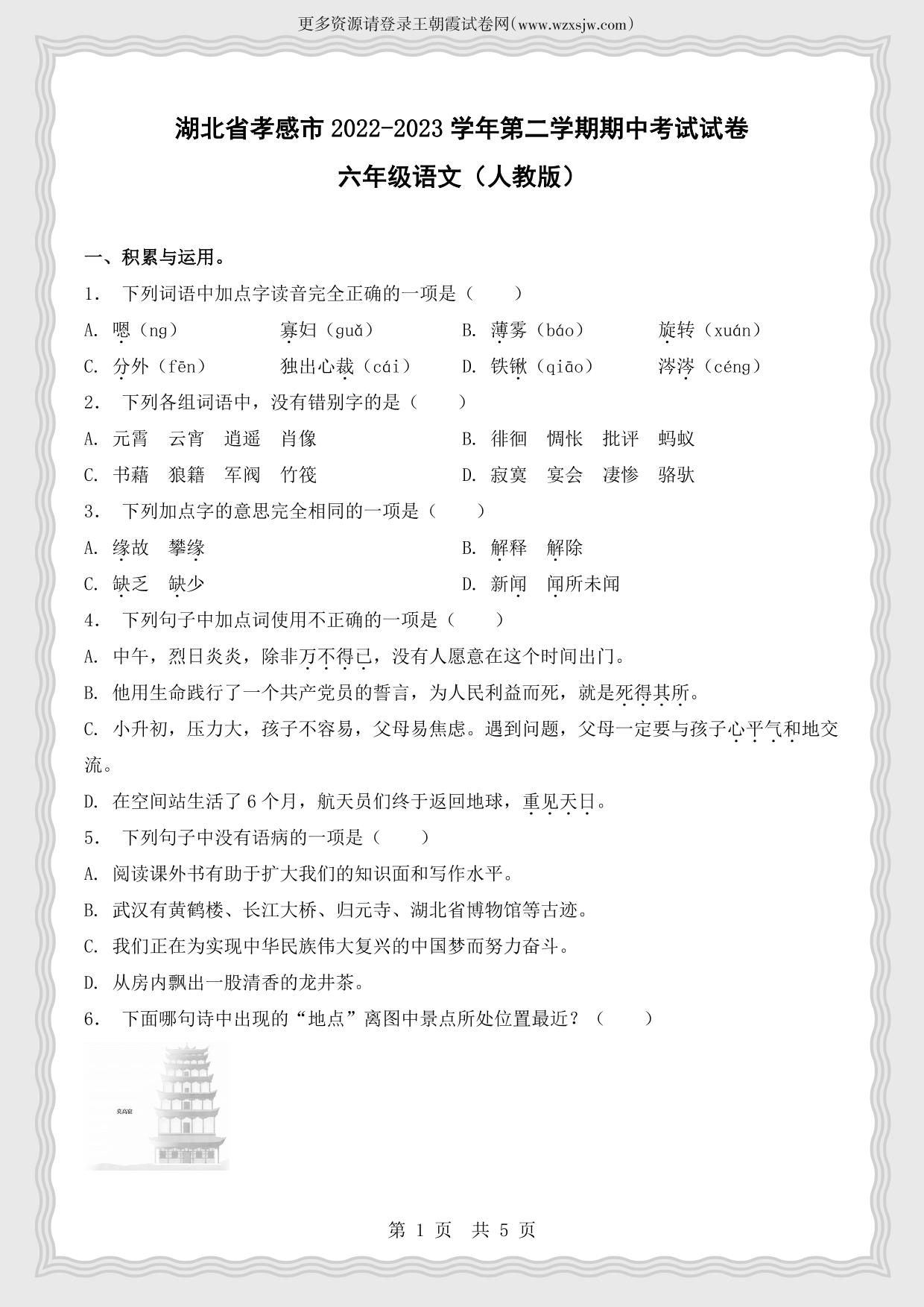 湖北省孝感市2022-2023学年第二学期期中考试试卷六年级语文(人教版)