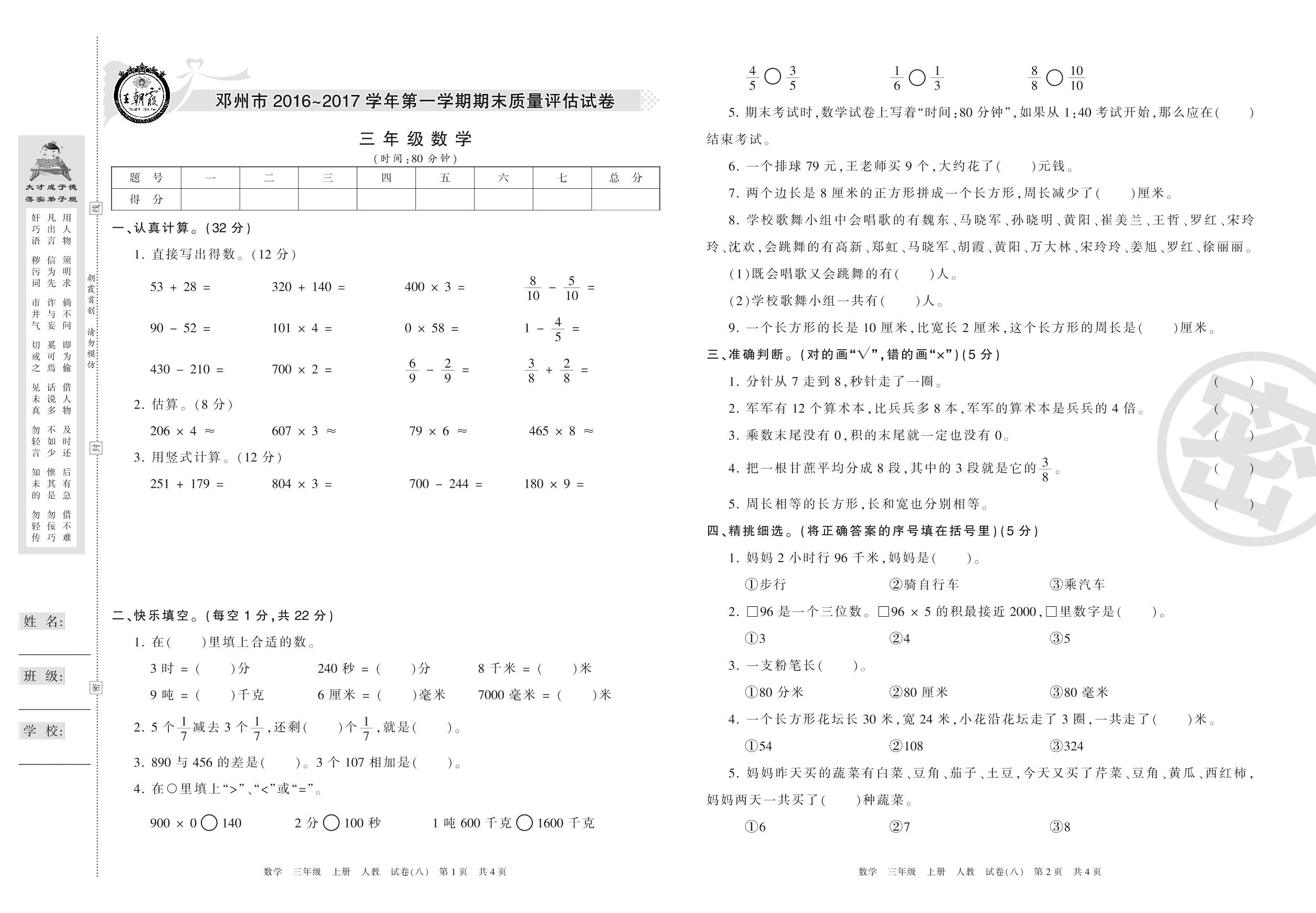 2016-2017学年第一学期邓州市三年级数学试卷(人教版)【8】